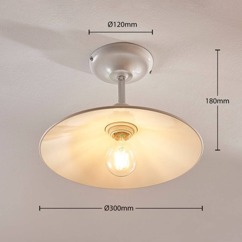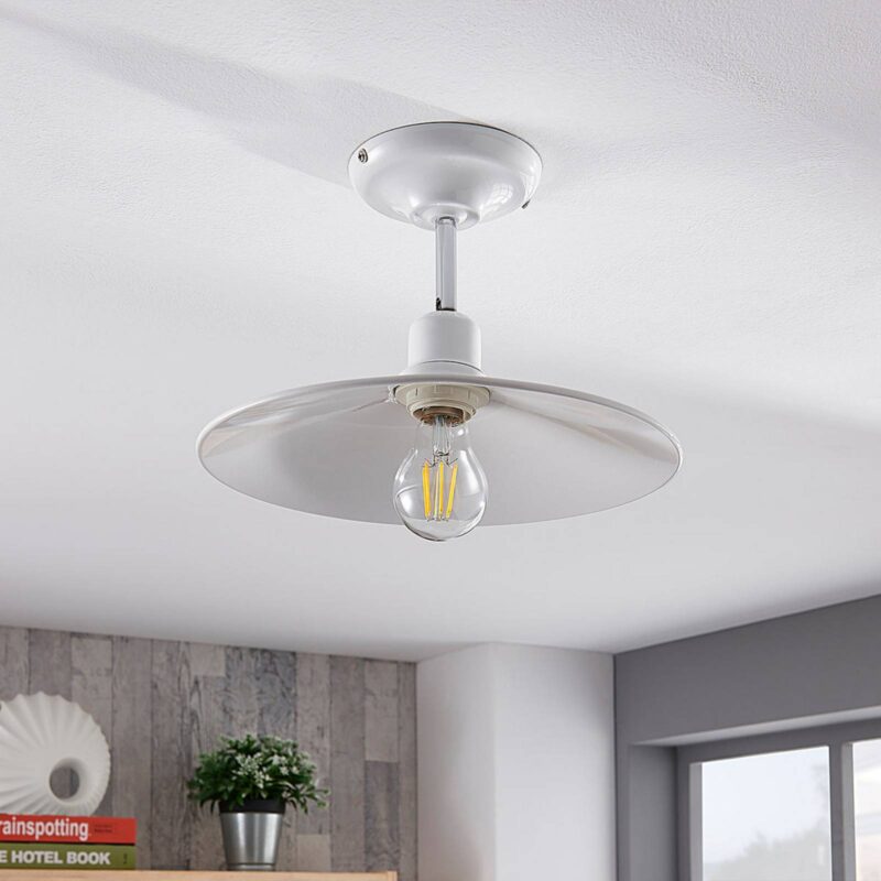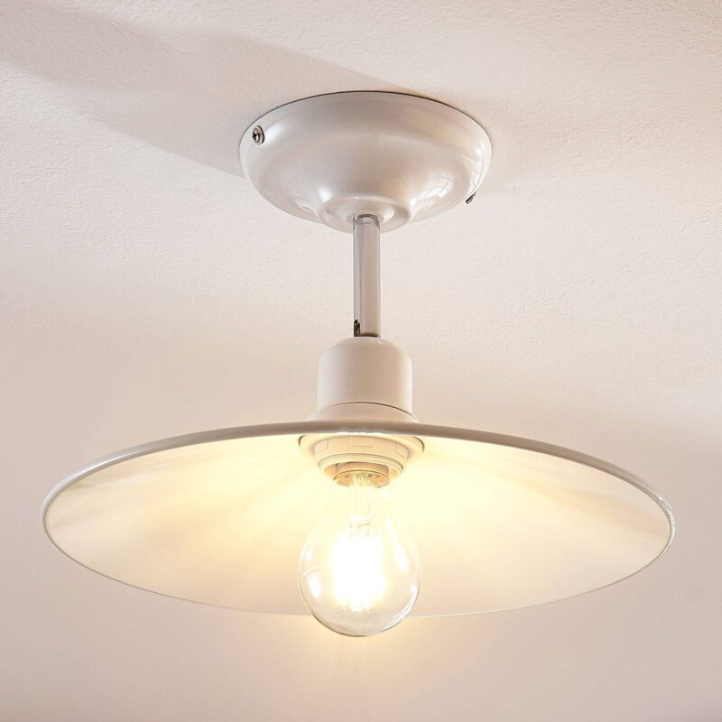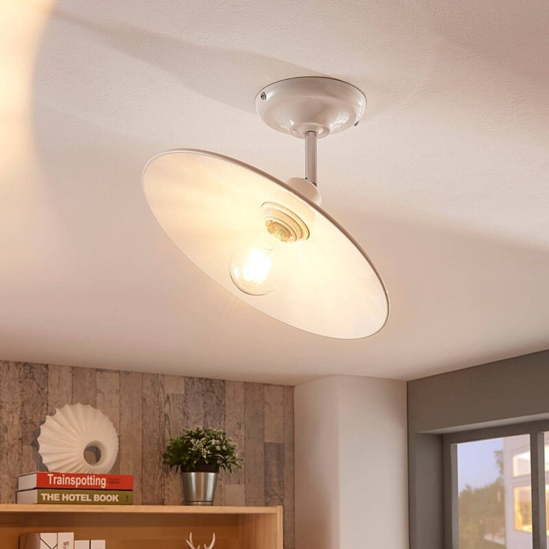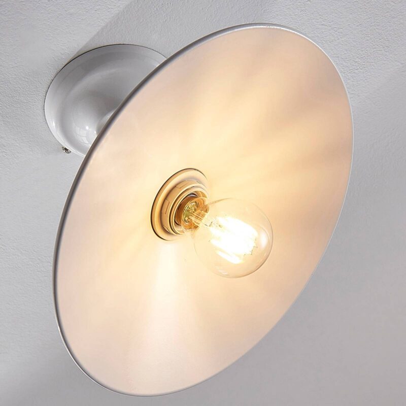 Okrúhle kovové stropné svietidlo Phinea s lesklým bielym povrchom Toto stropné svietidlo má bezpochyby starožitný vzhľad a pripomína osvetlenie z dôb minulých – v dobrom slova zmysle. Ploché tienidlo je vyrobené z kovu a je otvorené smerom dolu, preto by ste sa nemali pri výbere zdroja unáhliť a zvoliť ideálnu štýlovú žiarovku. Veľmi vhodné sú napríklad LED žiarovky s viditeľným vláknom alebo v rustikálnom štýle. Lesklý biely povrch je možné kombinovať s mnohými interiérovými štýlmi, ale Phinea môže byť tiež použitá spolu so starožitným nábytkom.