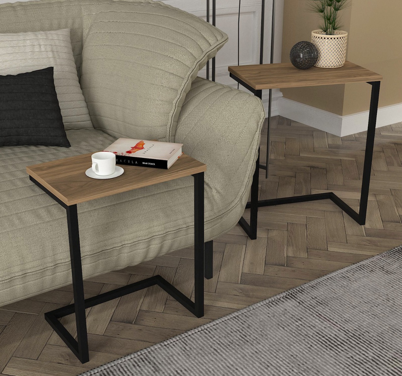 Set príručných stolíkov BILL v jednoduchom prevedení a zaujímavom tvare, vhodný na odloženie kníh, časopisov a ostatných drobností, ktoré chcete mať vždy po ruke. Stolíky sa ľahko kombinujú s akýmkoľvek nábytkom a vďaka svojmu prevedeniu budú ozdobou nejedného interiéru. Materiál: kvalitné 18 mm LTD + kovFarebné prevedenie: čierna / dub kamanRozmery: v49/59 x š48/43 x h27/30 (rozmery v nákrese)Dodávame v demonte.