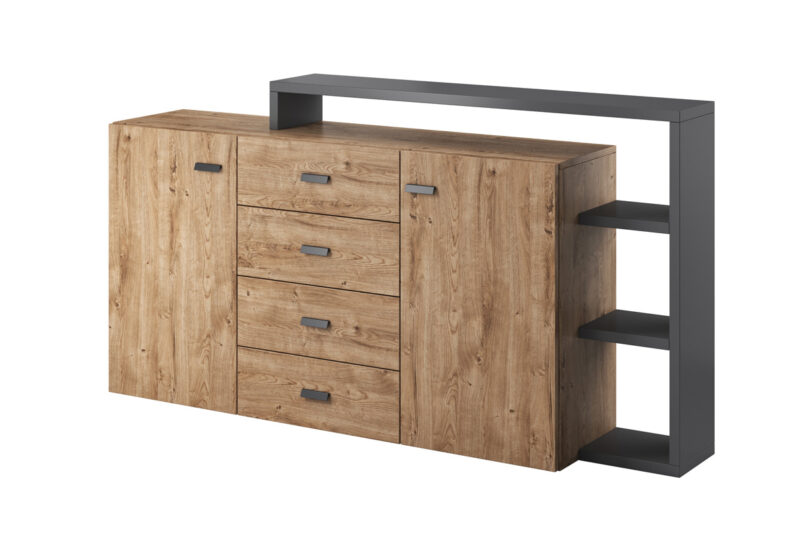 Kombinovaná komoda BILSBY patrí ku prvkom obývacieho sektoru BILSBY, z ktorých si vyskladáte dizajnovú a funkčnú obývaciu stenu. Je vhodná do moderných a nadčasových interiérov.Komoda je vyrobená z LTD dosky, ktorá je nenáročná na údržbu. Okraje nábytku sú chránené ABS hranami. Je vo farebnom prevedení: antracit, dub ribeck.Komoda je dvojdverová. V každej časti sa nachádza jedna polica. V strednej časti sa nachádzajú štyri praktické zásuvky. Disponuje tiež nadstavbou s otvorenými úložnými priestormi, kam si môžete uložiť knihy, dekorácie a podobne.Rozmery (š,v,h): 180 x 80 x 37 cm.BILSBY je kolekcia moderného a štýlového obývacieho nábytku, ktorá vás zaujme svojim elegantným a zároveň jednoduchým vzhľadom. Je vhodná do moderných interiérov menších aj väčších rozmerov. Charakteristickou črtou kolekcie BILSBY je asymetrický tvar jednotlivých prvkov, ktorý je nielen funčkný ale stane sa tiež dekoráciou vašej obývačky.Dodávame v demontovanom stave.