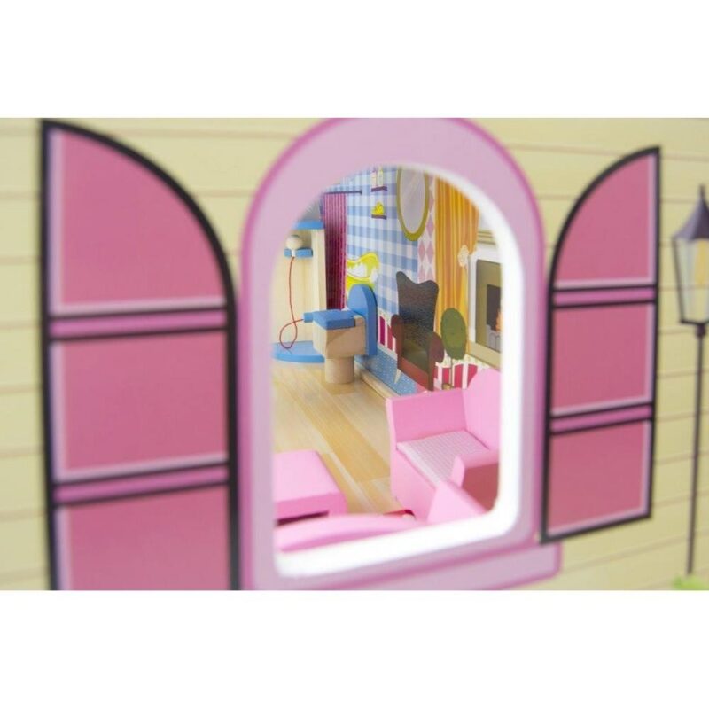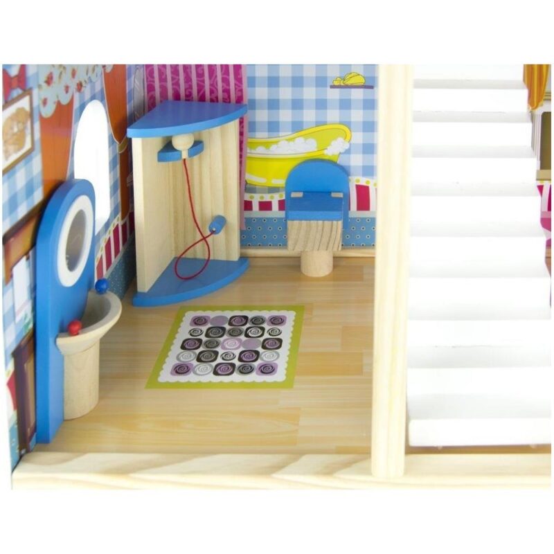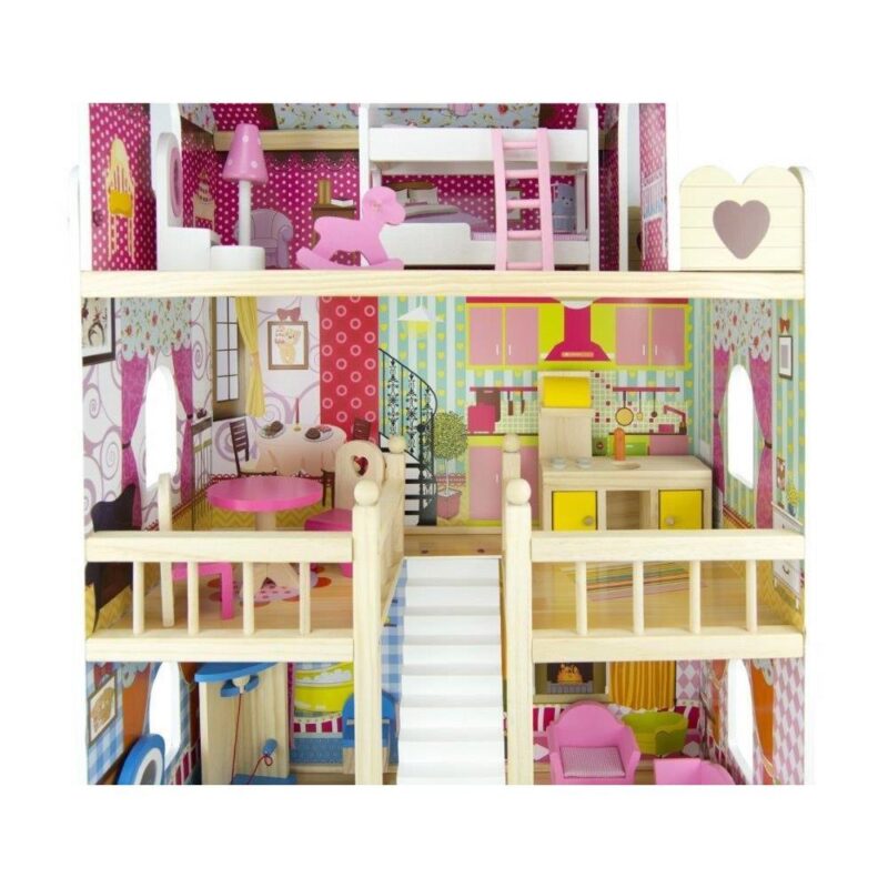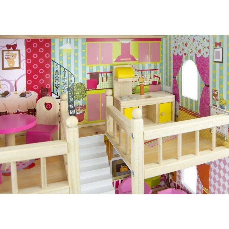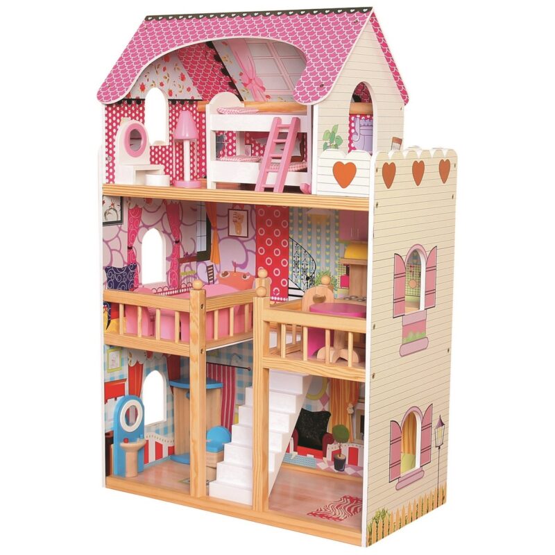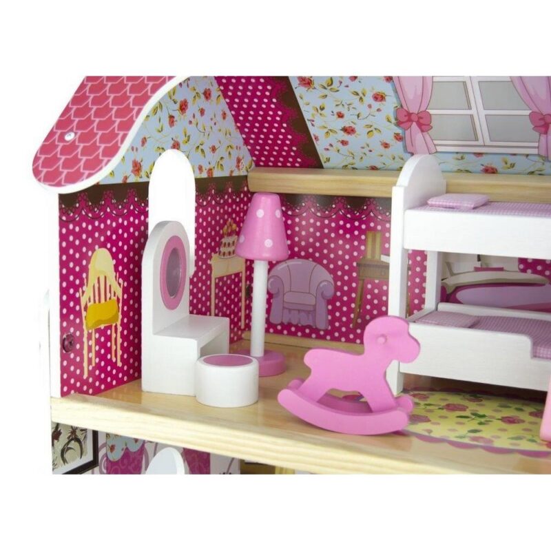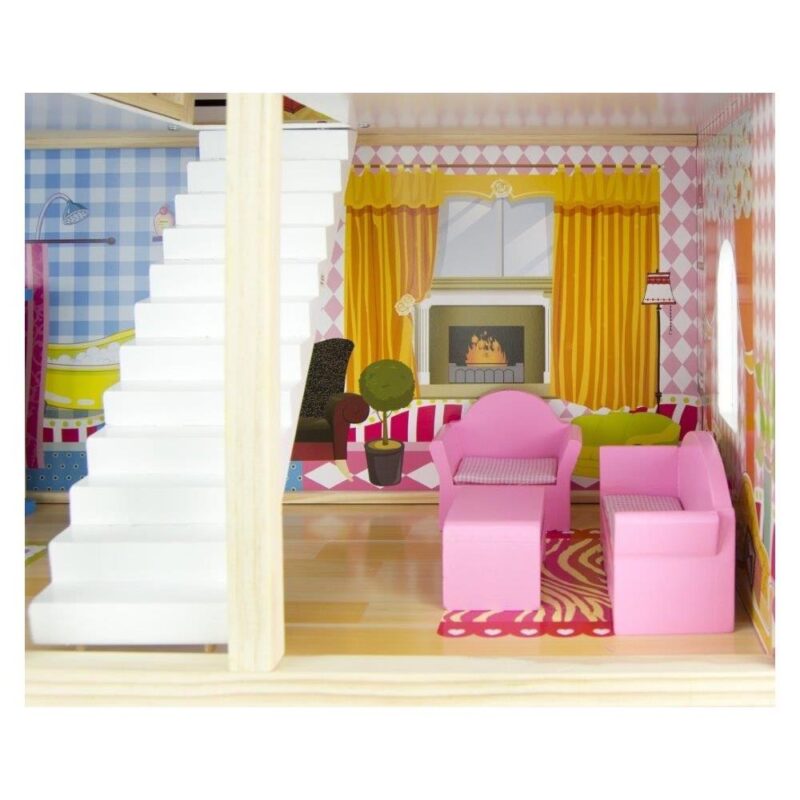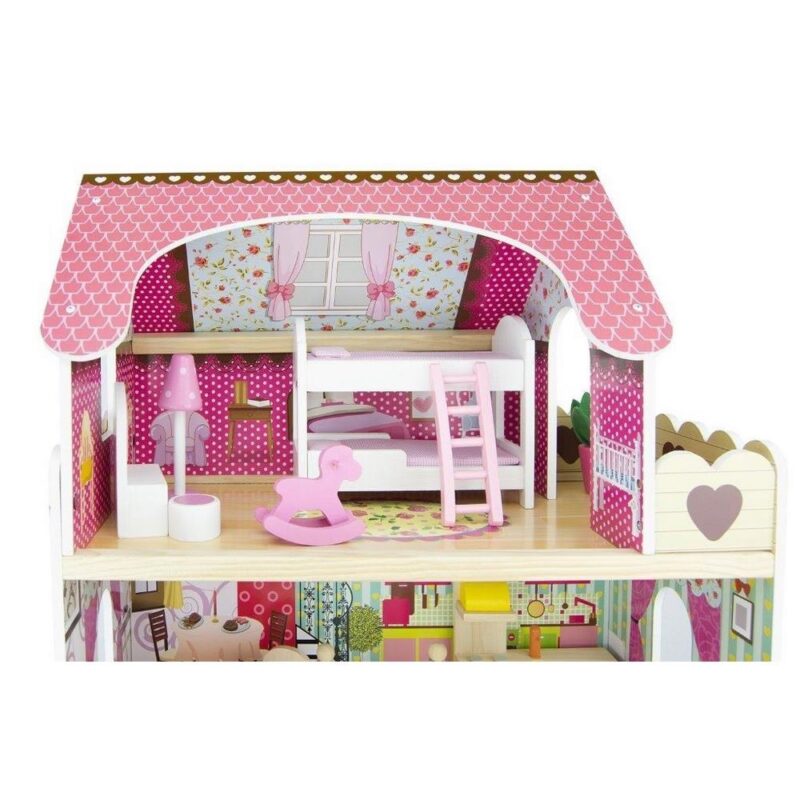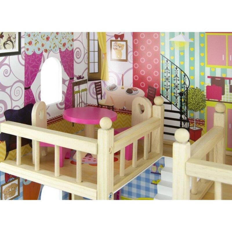 Tento krásny drevený domček pre bábiky urobí radosť každej malej princeznej. Je vhodný pre bábiky veľkosti Barbie. Vďaka svojmu farebnému a hravému vzhľadu bude vkusnou hračkou, ktorá vaše dieťa len tak neomrzí. Domček je veľmi priestranný, má terasu a obsahuje 17 kusov nábytku.