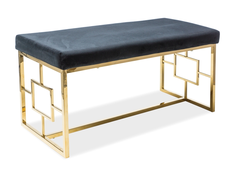 Moderná čalúnená lavica s atraktívnou konštrukciou. Pohodlné hladké čalúnenie je v čiernej zamatovej látke. Konštrukciu lavice tvorí nehrdzavejúca oceľ v luxusnom zlatom prevedení.Rozmery lavice (výška/šírka/hĺbka v cm): 48/100/46. Lavicu môžete umiestniť tak do predsiene, chodby, ako aj spálne či obývačky. V našej ponuke nájdete aj ďalšie čalúnené lavice.