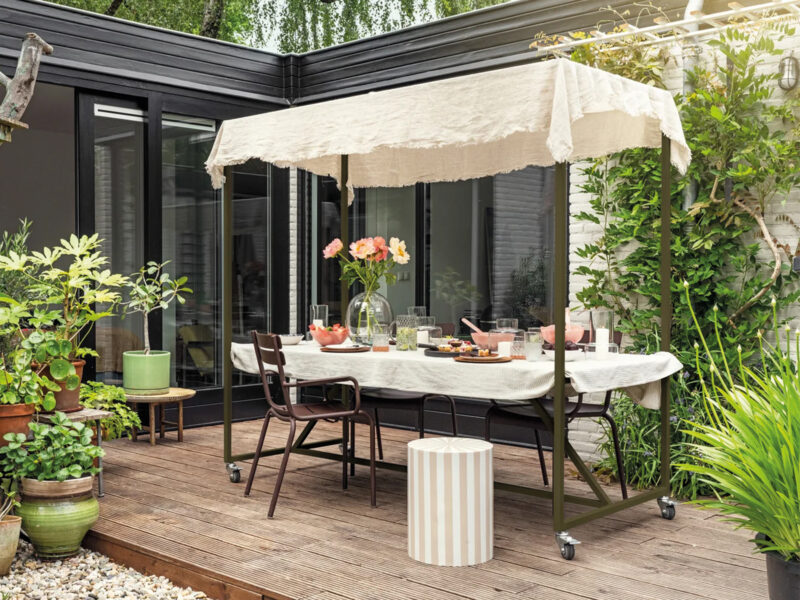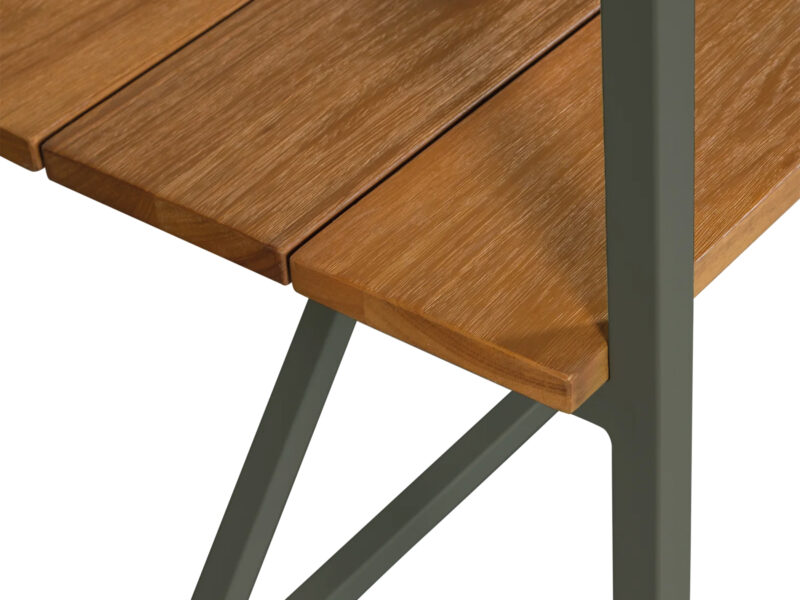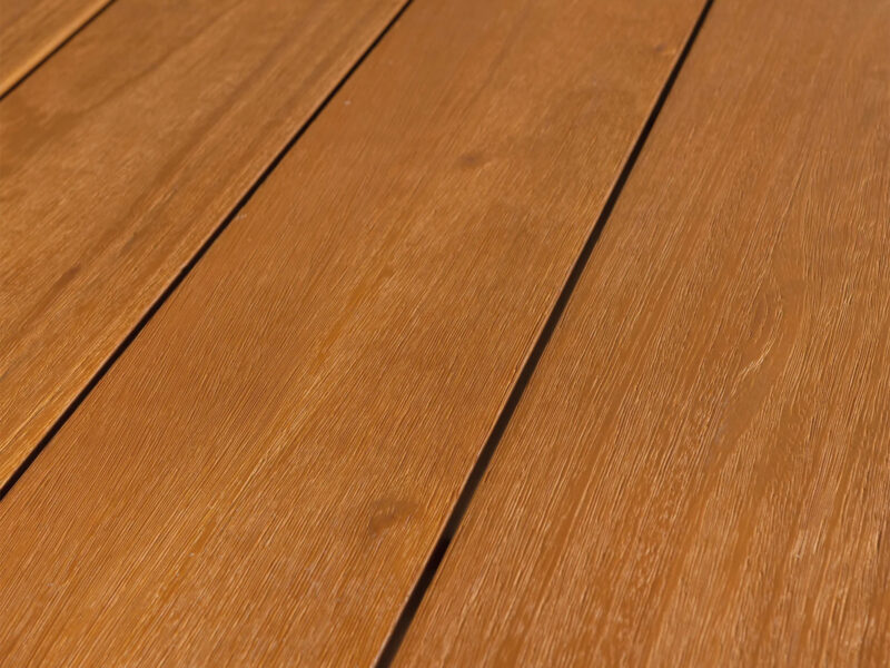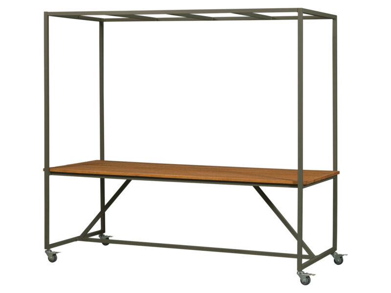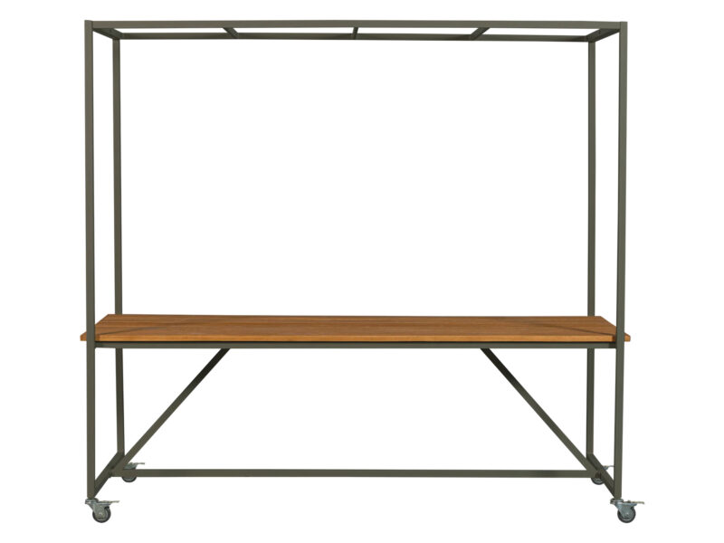 Unikátny jedálenský stôl vyrobený z eukalyptového dreva s dekoratívnym obvodovým rámom a kolieskami.