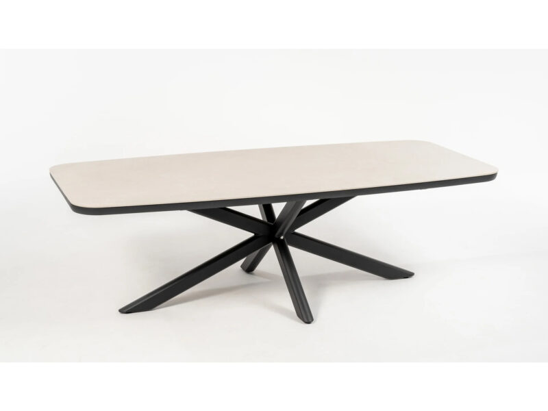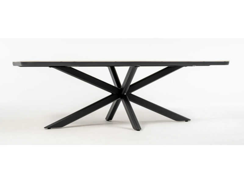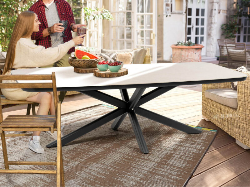 Jedálenský stôl Boat s hliníkovým rámom a odolnou doskou zo sintrovaného kameňa spája moderný dizajn s vysokou odolnosťou, ideálny pre interiér aj exteriér.