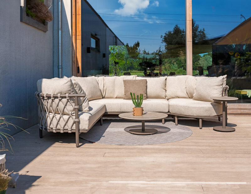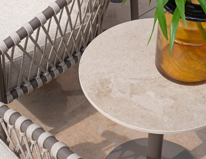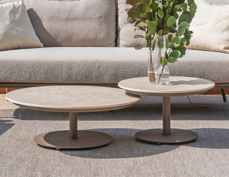 Boaz stolík s okrúhlou keramickou doskou a oceľovou konštrukciou je elegantný a univerzálny doplnok k sedacím súpravám, kreslám alebo lehátkam. V sivom odtieni dokonale zapadne do moderného exteriéru.