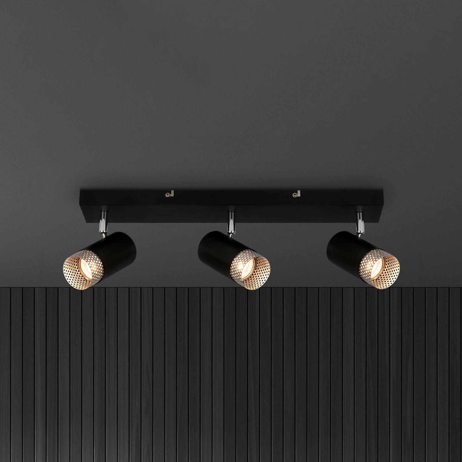 Trojlampový stropný reflektor Plek z kovu v čiernej farbe s matne striebornými nástavcamiStropný reflektor Plek sa prezentuje absolútne moderným spôsobom vďaka kombinácii hladkej čiernej farby, krátkych ramien v chrómovej farbe a nástavcov na svetelných vývodoch v matne striebornej farbe, ktoré svojím vzorom otvorov ovplyvňujú nielen vzhľad stropného reflektora, ale aj svetelný efekt. Tri valcové hlavice sa dajú tiež otáčať a vychyľovať, takže povrchový reflektor Plek sa dá dokonale prispôsobiť príslušným podmienkam.