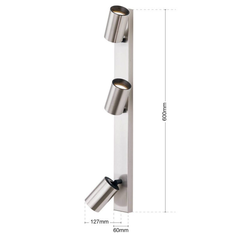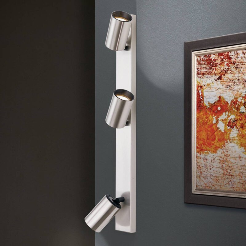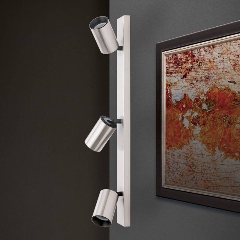 Trojlampový reflektor Sean s nastaviteľnými bodmi Každý bod tohto trojlampového svietidla Sean, ktoré možno voliteľne namontovať aj na strop, možno otáčať o 355°, čo umožňuje širokú škálu možností osvetlenia – od veľkoplošného osvetlenia miestnosti až po cielené zameranie na jednotlivé oblasti alebo objekty v miestnosti. Moderný dizajn v matnom saténovom nikli ladí s mnohými súčasnými štýlmi nábytku a farbami domácností. – Externe stmievateľné – Odrazové vložky čierne