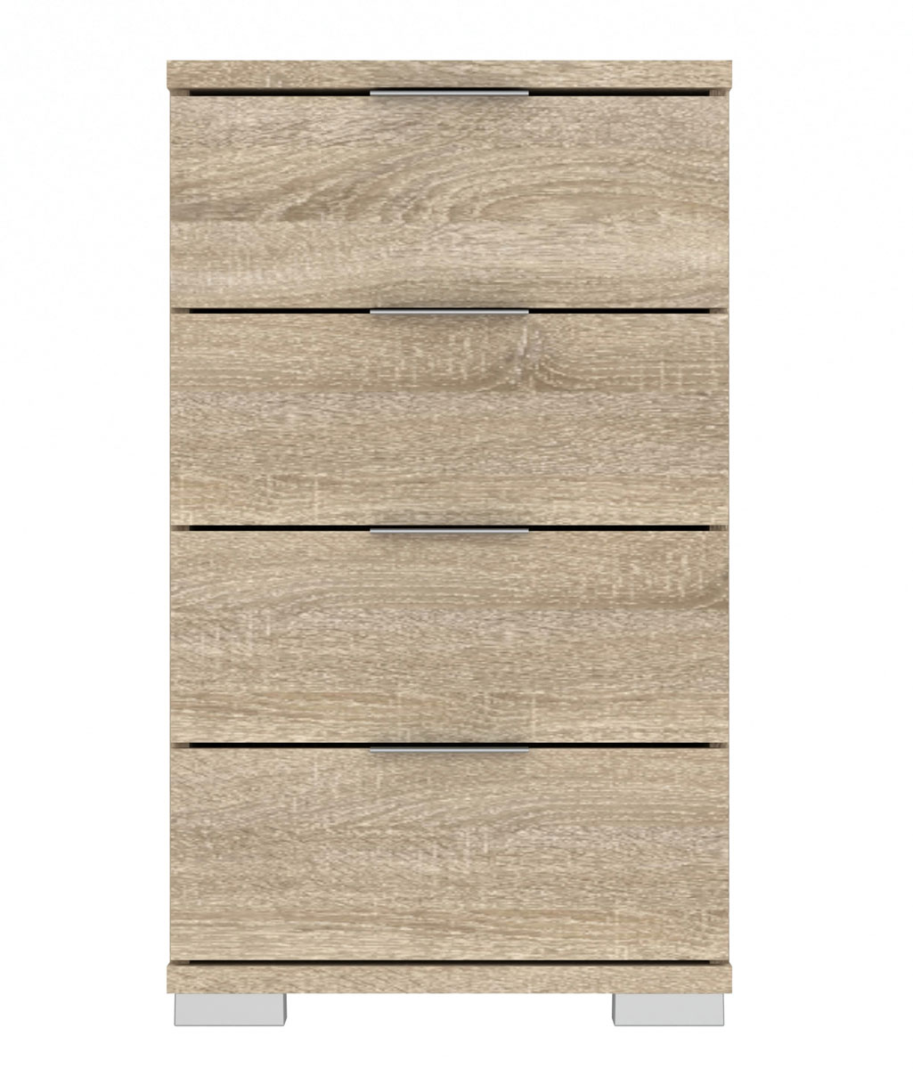 Komoda BOLOGNA Vás upúta svojím praktickým riešením a zároveň cenovou dostupnosťou. Je vyrobená z kvalitného LTD materiálu, ktorý sa jednoducho udržiava. Komoda Vám poskytne dostatočný odkladací priestor vo forme 4 výsuvných šuplíkov. Úchyty a nožičky sú strieborné.Rozmery (ŠxVxH) : 46 x 78,7 x 42 cmFarebné prevedenie : dub sonomaDodávame v demonte.