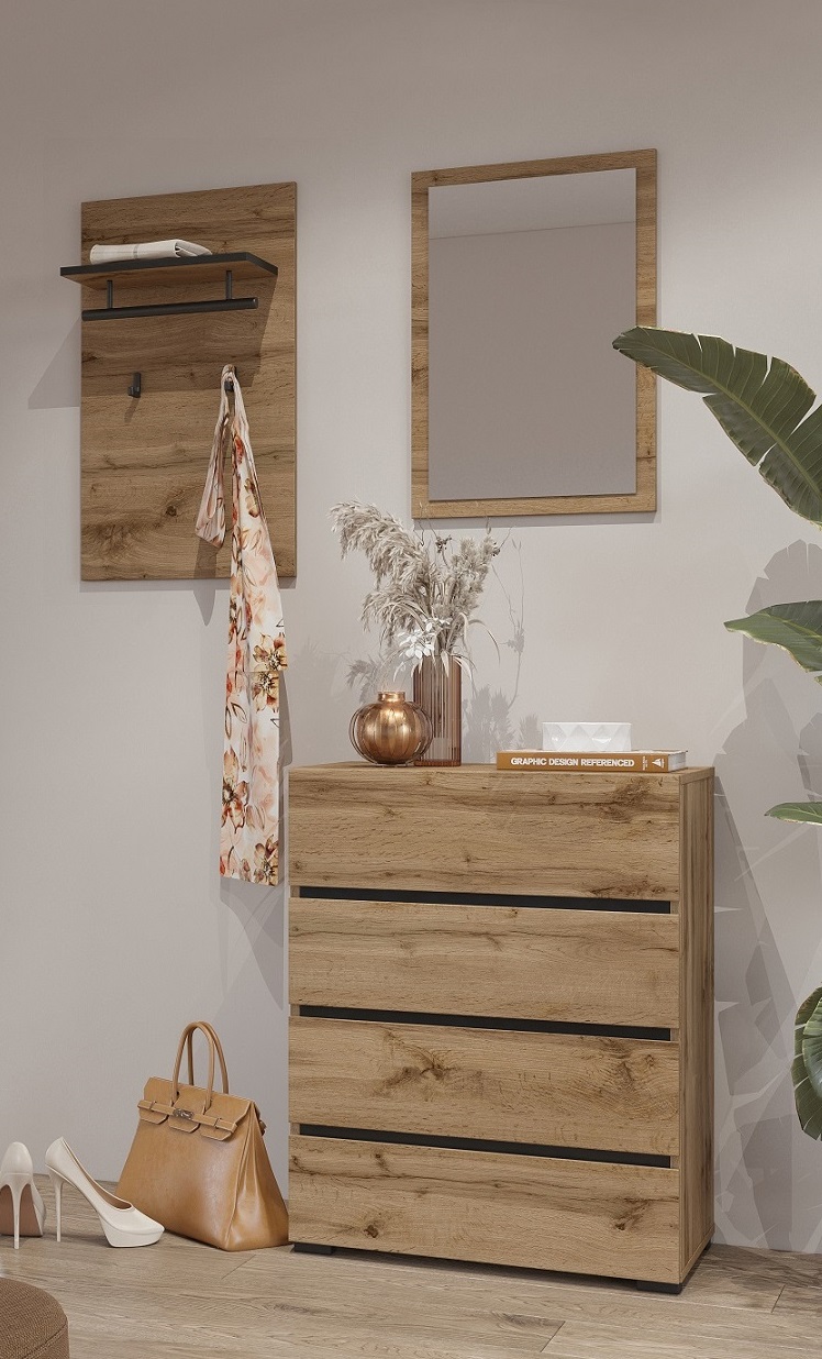Nábytok BRENDON je skvelým riešením pre organizáciu vašej obývačky, spálne či predsiene. Vďaka svojmu modernému dizajnu a praktickému usporiadaniu ponúka dostatok úložného priestoru pre všetky vaše potreby.Nábytok BRENDON je vyrobený z kvalitných LTD dosiek, ktoré sa jednoducho udržiavajú.Farebné prevedenie: dub Wotan, čierna.Zostava sa skladá z:vešiakový panel (š,v,h): 40 x 70 x 20 cmzrkadlo (š,v,h): 40 x 60 x 2 cmzásuvková komoda (š,v,h): 60 x 78 x 40 cmDodávame v demontovanom stave.