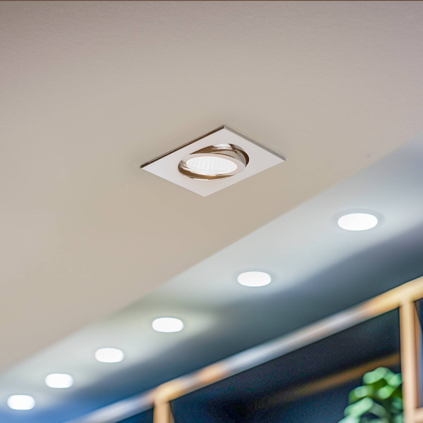 LED zapustené stropné svietidlo BB05, štvorcové, otočné, s fázovým rezom (RC), stmievateľné Zapustené stropné svietidlo BB05 je flexibilné stropné svietidlo pre suché interiéry – od kuchyne cez chodbu až po konferenčnú miestnosť. Má hranatý hliníkový rám a okrúhlu, nastaviteľnú hlavu svietidla. Na montáž do stropného otvoru je BB05 vybavené dvoma pridržiavacími pružinami. Zapustené stropné svietidlo nesmie byť zakryté tepelnoizolačným materiálom. – Vrátane dlhého LED meniča, stmievateľného prostredníctvom vypínania fázy (RC) – Uhol vyžarovania: 38° – Rozsah natočenia: 30° dookola – Hrúbka stropu: max. 1,3 cm