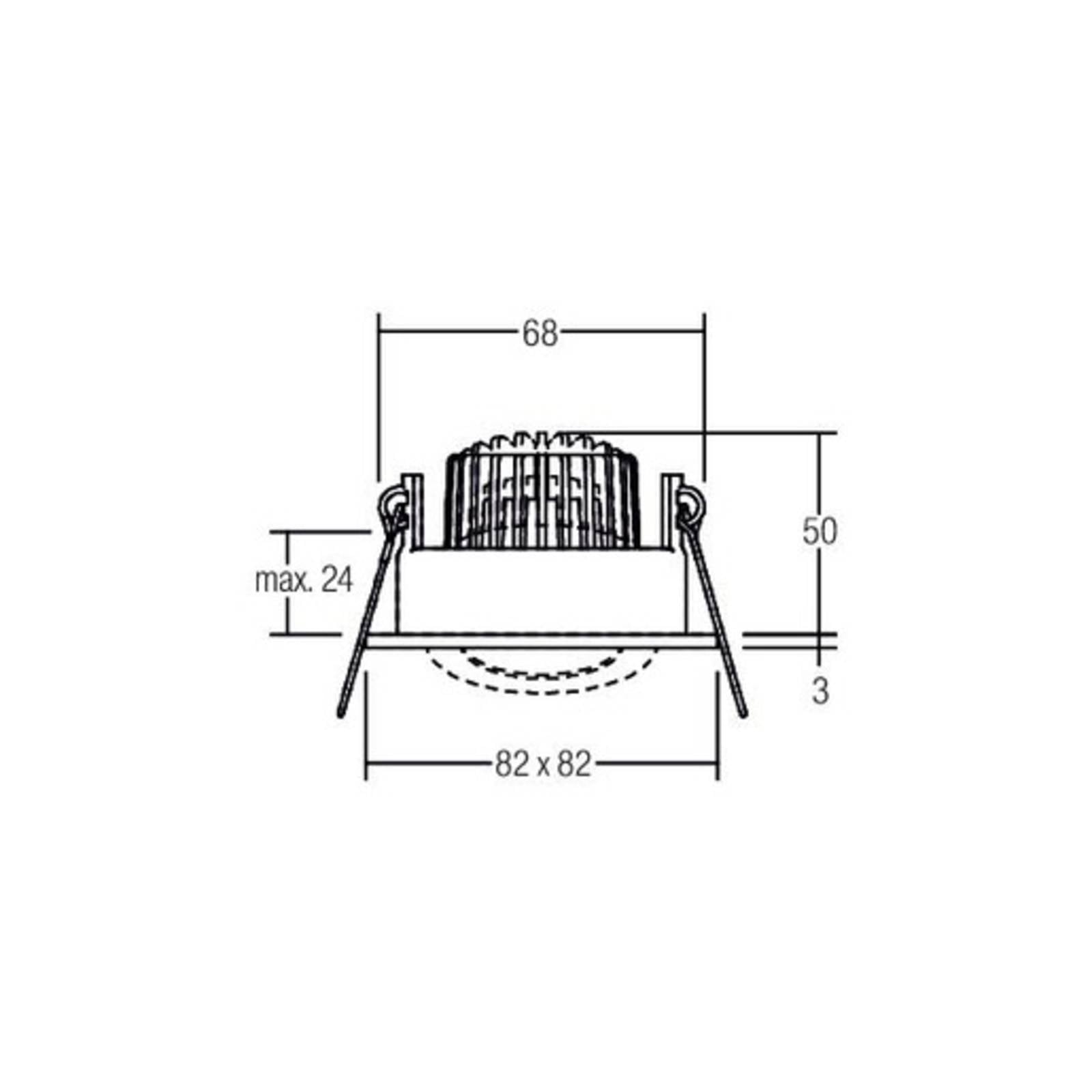 Štvorcové stropné svietidlo s krytím IP65 a nastaviteľnou hlavou Toto stropné svietidlo s jednoduchým hranatým rámom a okrúhlou hlavou s reflektorom sa hodí do mnohých moderných interiérov. Vďaka ochrane proti prúdom vody ho možno bez problémov použiť napríklad aj v kúpeľniach. Ako praktické detaily má zapustené bodové svietidlo LED s krytím IP65 nastaviteľnú svetelnú hlavu a dve montážne pružiny na upevnenie do výrezu v strope bez použitia náradia – Súčasťou je nestmievateľný LED konvertor – Uhol vyžarovania: 38° – Rozsah otáčania: 30° dookola – Hrúbka stropu: max. 2,4 cm