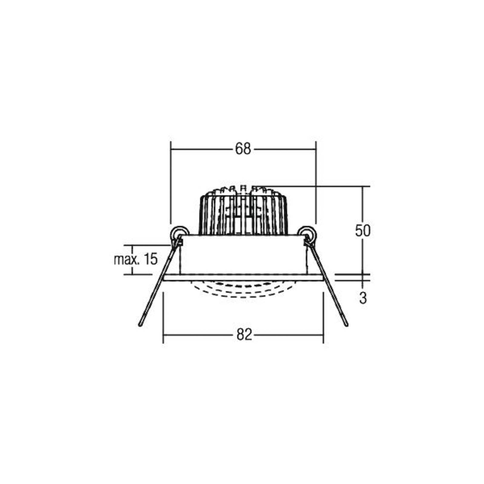 Tirrel-R zapustený LED reflektor s prepínateľným ovládacím zariadením Tirrel-R je okrúhly zapustený LED reflektor vyrobený z pevného hliníka, ktorý sa dodáva s prepínateľným ovládacím zariadením a dá sa inštalovať bez použitia náradia pomocou montážnych pružín. Zapustený reflektor zaručuje vysokú svetelnú účinnosť a optimálne rozloženie svetla vďaka striebornému reflektoru s vysokým leskom s rotačne symetrickým, úzkoširokouhlým rozložením svetla a priehľadnému sklenenému krytu – všeobecný index podania farieb CRI > 80 – prípustná teplota okolia (ta): -20 °C – +25 °C – trieda ochrany (EN 61140): II, stupeň ochrany (DIN EN 60529): IP20 – s elektronickým ovládacím zariadením, prepínateľný – otočný o 20° – bez viditeľného zacvakávacieho krúžku