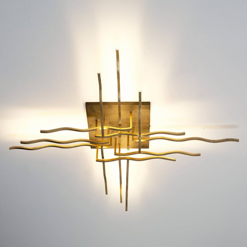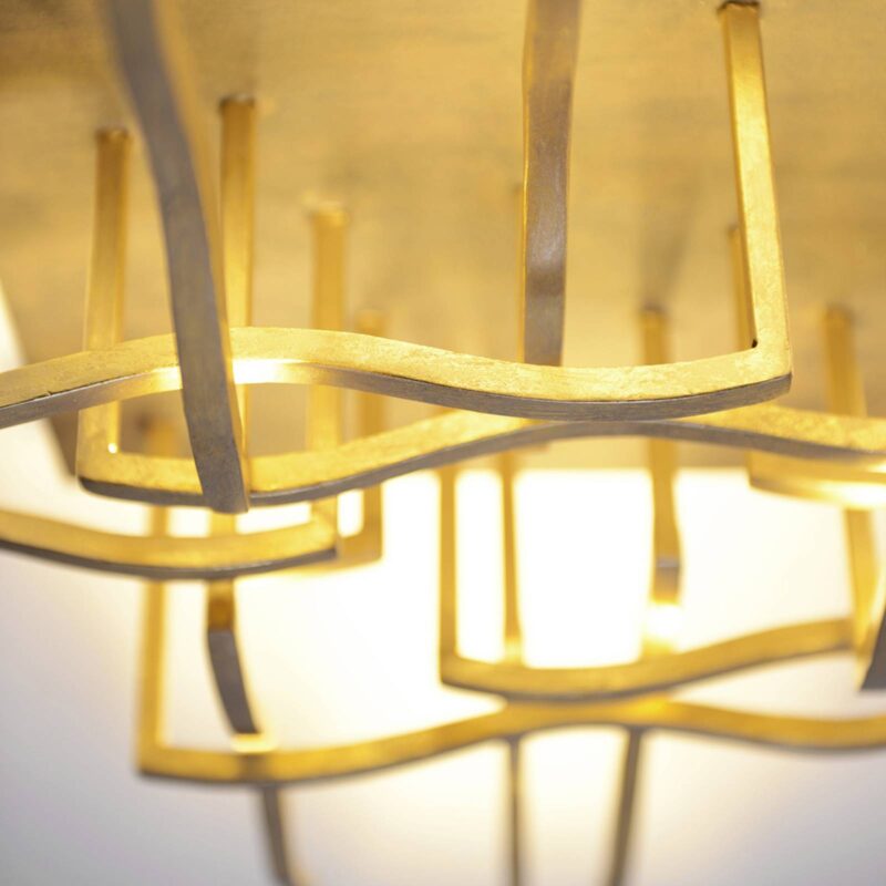 Nepriamo svietiace stropné svietidlo Buffet LED v hnedej a zlatej farbeStropné svietidlo Buffet LED nie je výnimočné len vizuálne, pretože je nápadito navrhnuté so zakrivenými vzperami zlatej farby, ktoré smerujú do všetkých strán od štvorcovej stropnej dosky hnedej farby. Z hľadiska svetelnej technológie tiež prekonáva bežné stropné svietidlá, pretože LED diódy, ktoré boli nainštalované žiariace smerom nahor v zlatých vzperách, poskytujú energeticky úsporné, veľmi teplé osvetlenie s farbou svetla 2 700 Kelvinov. Okrem toho je vďaka rozmerom 123 cm na dĺžku a šírku na strope majestátnym pútačom pozornosti.
