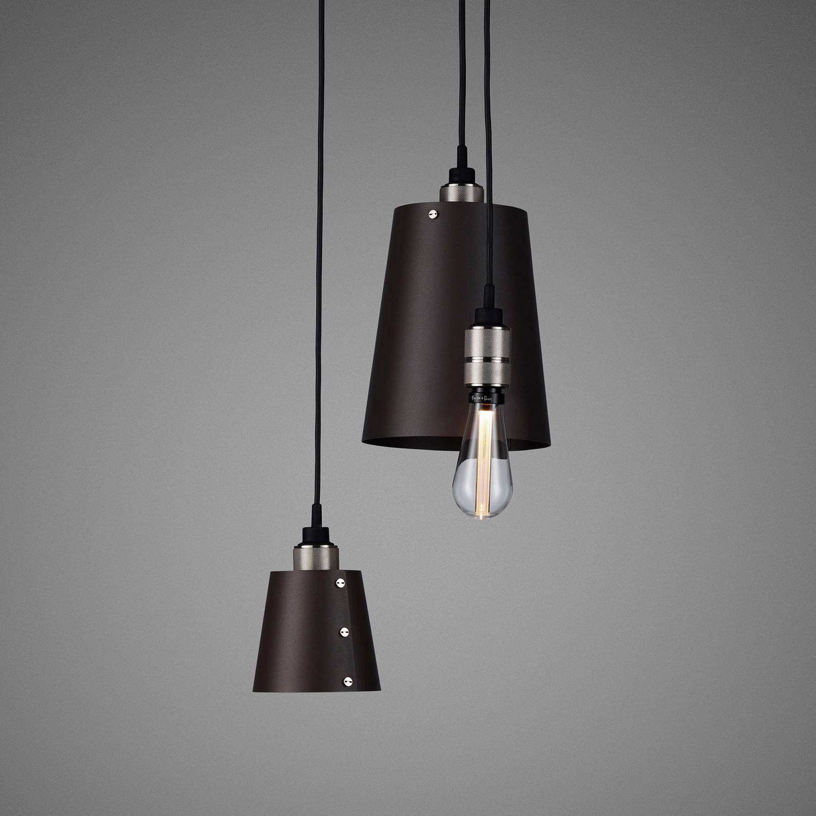 Závesné svietidlo Hooked 3.0 mix s kovovými tienidlami a samostatnými závesmi Hooked 3.0 mix je závesné svietidlo s tromi lampami, ktoré pozostáva z okrúhleho vrchlíka a troch závesov. Zatiaľ čo jeden záves je vybavený len zásuvkou, ďalšie dva sú navyše vybavené kovovými tienidlami rôznych veľkostí. Tienidlá sa zatvárajú viditeľnými kovovými skrutkami. Každý z troch príveskov možno zavesiť samostatne pomocou samostatných pevných kovových háčikov, ktoré sú súčasťou dodávky. To možno vykonať priamo na vrchlíku alebo decentrálne priskrutkovať k stropu (závit M5), takže svietidlo možno navrhnúť v najrôznejších usporiadaniach. Hooked 3.0 mix je svietidlo od spoločnosti Buster Punch. Spoločnosť, ktorá bola založená v roku 2013 a sídli v Londýne, vyrába nielen svietidlá, ale aj funkčné armatúry a nábytkové predmety z masívnych kovov, ktoré inšpirujú svojím nezávislým dizajnom a technickou prepracovanosťou.