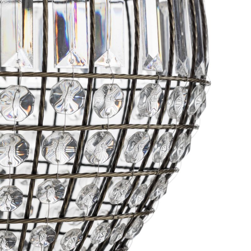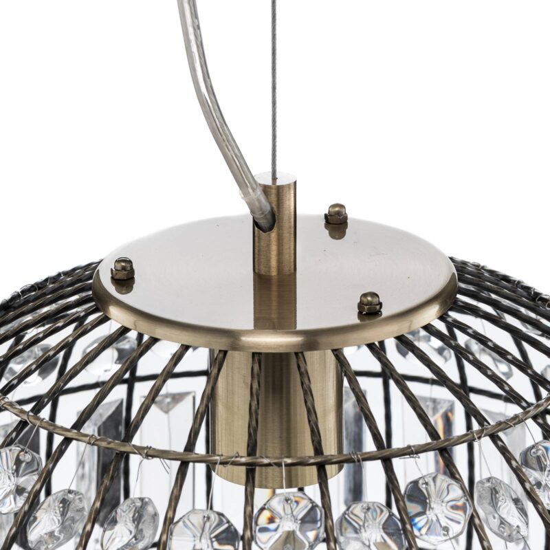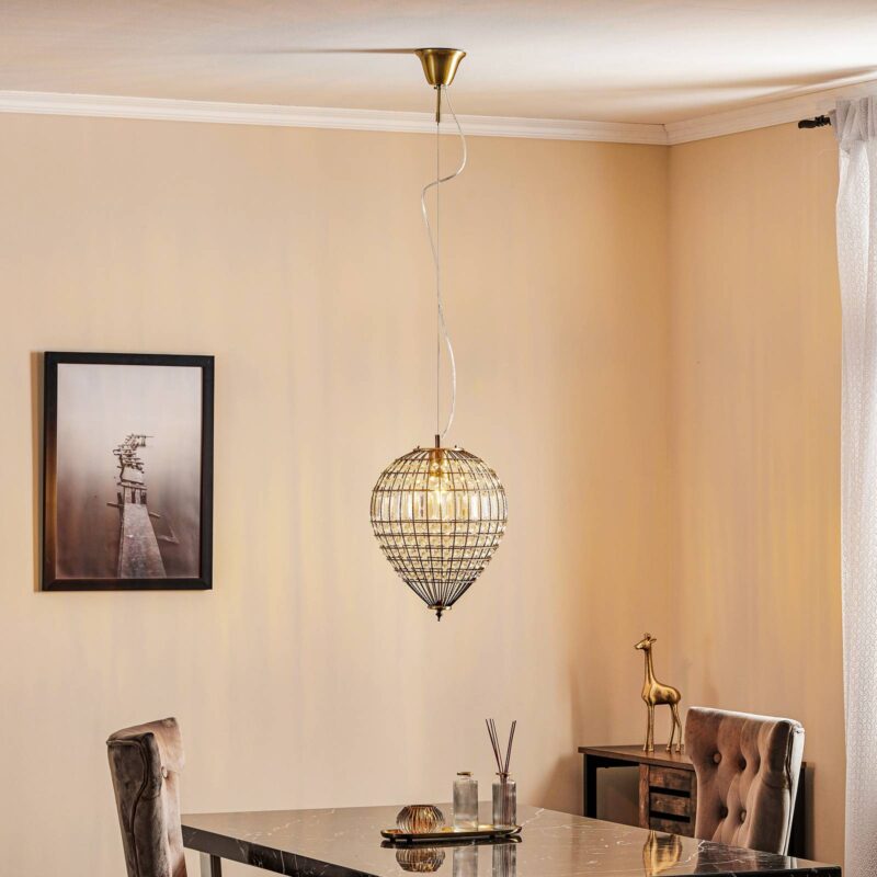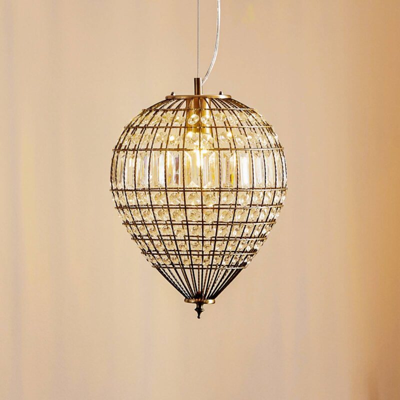Starožitné závesné svietidlo Amadeus s brúsenými sklenenými prvkami Amadeus je dekoratívny zdroj svetla, ktorý je ideálny na použitie nad obývacou izbou alebo jedálenským stolom. Kovové vzpery v čiernej a šedej farbe so starožitným povrchom tvoria telo, ktorého tvar vystihuje znaky kvapky, oválu alebo srdca. Medzi vzpery sú pridané brúsené prvky z číreho skla; tieto lámu vznikajúce svetlo tak, že – najmä v kombinácii s žiarovkou s guľovým vláknom – je miestnosť obohatená o atmosférické svetelné efekty.