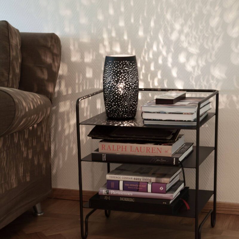 Stolná lampa Colby s presvitajúcim osvetlením Cez otvory vyrazené do kovu, ktoré nechávajú svetlo presvitať, poskytuje lampa Colby útulné, príjemné svetlo v každej miestnosti. Lampa je pomerne jednoduchá a mierne vypuklého tvaru a vyznačuje sa pieskovou povrchovou úpravou v čiernej farbe. Žiarovku pre objímku E27 si môže zvoliť sami. Lampa Colby vytvára útulné akcenty osvetlenia na chodbách a v obytných priestoroch.