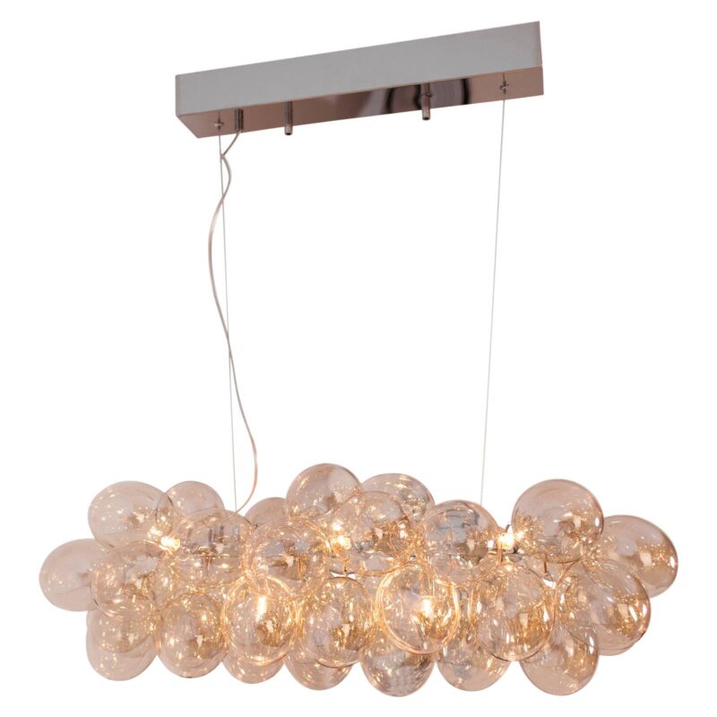 Predĺžená sklenená závesná lampa Gross Bar Skombinovalo sa niekoľko malých sklenených guľôčok, ktoré vytvorili mrakovú štruktúru pre tienidlo na lampu závesnej lampy Gross Bar – a medzi nimi je vždy žiarovková objímka. Žiarovky G9 (nie sú súčasťou balenia) v týchto objímkach poskytujú nielen osvetlenie, ale aj špeciálny lesk tohto prívesného svetla. Ak je to zapnuté, na svetle sa trblietajú aj sklenené gule.