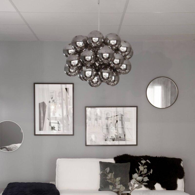 Sklenené gule ako mydlové bubliny: Tienidlo závesného svietidla Gross Grande Tienidlo závesného svietidla Gross Grande vyzerá ako súbor mnohých mydlových bublín alebo zhluk niekoľkých malých balónov, čo sa vlastne nedá označiť za tienidlo v klasickom zmysle slova. Svietidlo je samo o sebe úplným umeleckým dielom, pričom svetelné zdroje sú šikovne ukryté medzi sklenenými guľami. Celkovo osem objímok pre žiarovky G9 zabezpečuje osvetlenie a zároveň iskru a lesk, ktoré toto závesné svietidlo vyžaruje v miestnosti.