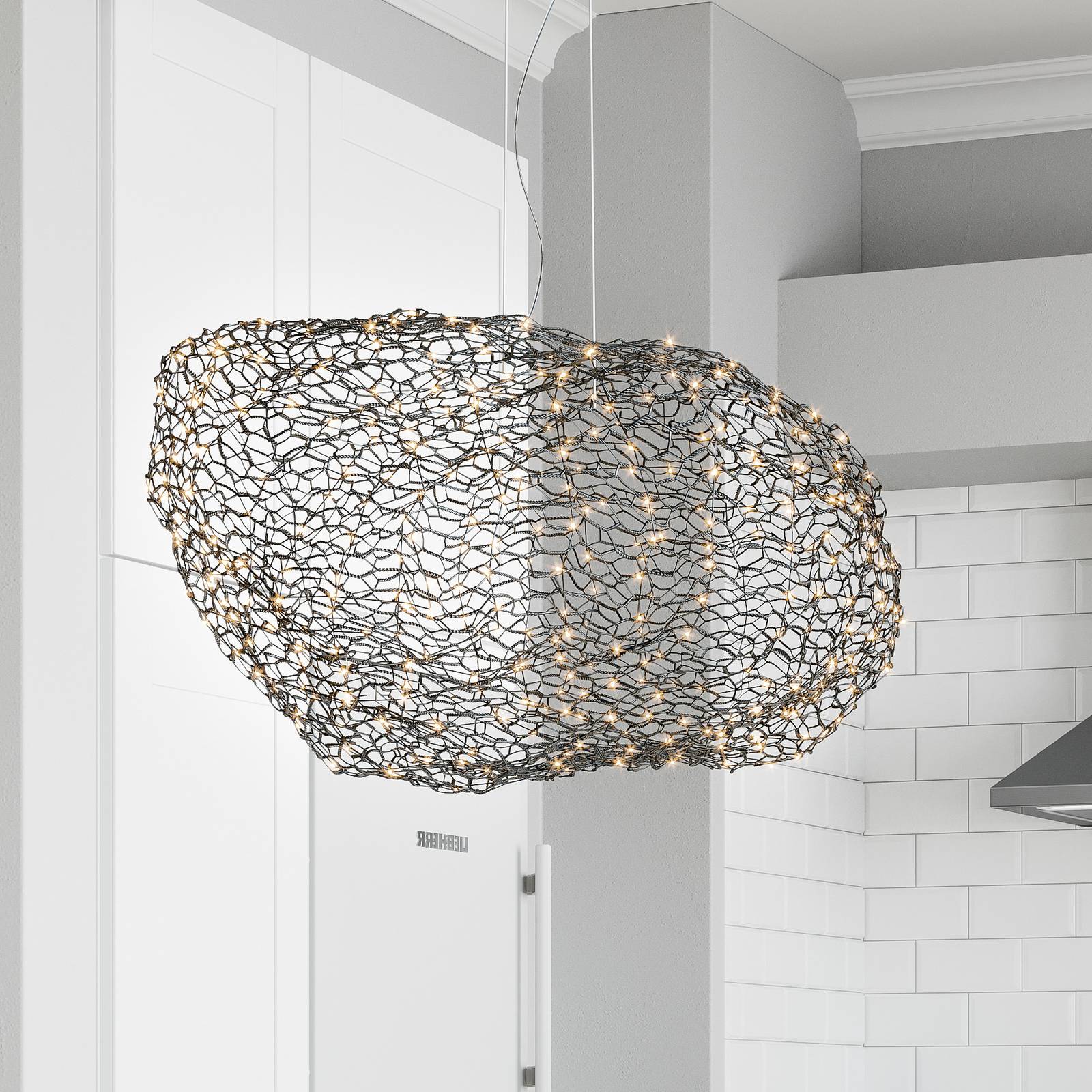 Ručne vyrobené závesné svietidlo LED Hayden v matnej čiernej farbeToto svietidlo sa stane skutočným pútačom pozornosti v každom modernom prostredí. Organický tvar jemnej kovovej mriežky ponecháva priestor na asociácie. Napevno je nainštalovaný teplý biely svetelný zdroj LED, ktorého svetlo žiari do všetkých strán cez jemné opracovanie kovového tienidla