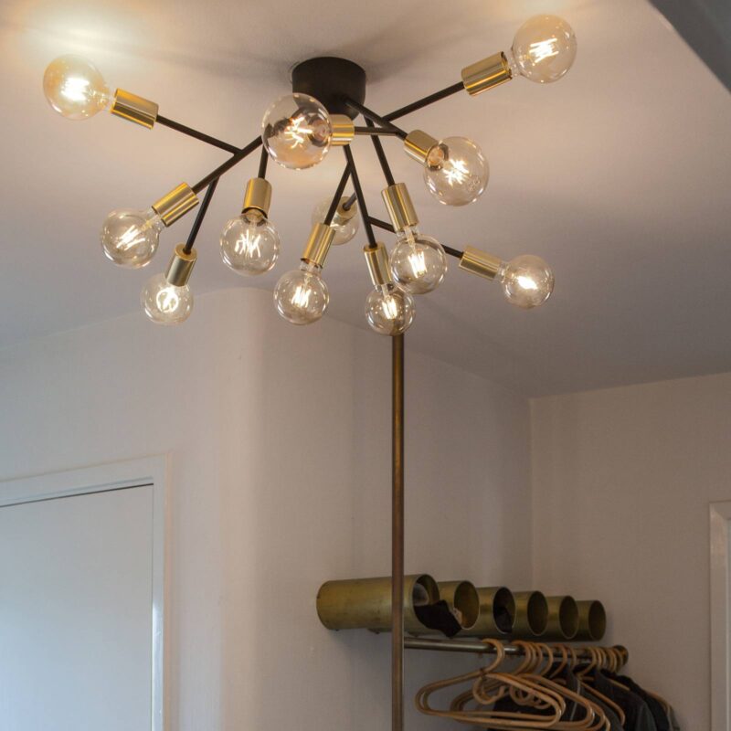 Stropné svietidlo Hero s dvanástimi svetlami v noblesnej čiernej a mosadzi – pôsobivý vzhľad Stropné svietidlo Hero zapôsobí efektnou kombináciou jednoduchých geometrických tvarov, ktoré vytvárajú komplexný a súčasne zhodný celok. Stropné svietidlo s dvanástimi svetlami navrhnuté v decentne noblesnej čiernej, ktorá sa efektne líši od valcových objímok s mosadznou povrchovou úpravou a vytvára tak dynamický vzhľad. Ďalšiu zmenu možno dosiahnuť použitím rôznych žiaroviek vo viacerých veľkostiach. Stropné svietidlo Hero s dvanástimi svietiacimi ramenami dokonale ladí s modernými bytovými zariadeniami, ako aj s racionálnymi koncepciami priemyselného bývania. V priestrannom podkroví, rozľahlej kuchyni alebo dokonca v širokej chodbe presvedčivo zapôsobí stropné svietidlo Hero s dvanástimi svetlami.