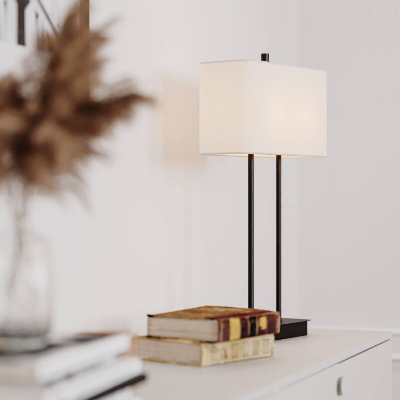 Moderná textilná stolová lampa Luton v bielej a čiernej farbe Napriek farebnému kontrastu čierneho rámu a bieleho tienidla vytvára stolová lampa Luton celkový harmonický obraz, ktorý ideálne dopĺňa modernú obývaciu izbu alebo spálňu. Vertikálne otvorená tienidlo na lampu z ľanovej textílie aj nožička z kovu sú navrhnuté v zaoblenom obdĺžnikovom tvare. Posledný menovaný má dvojnohý stojan, ktorého stredové predĺženie vyčnieva z hornej časti tienidlo na lampu .