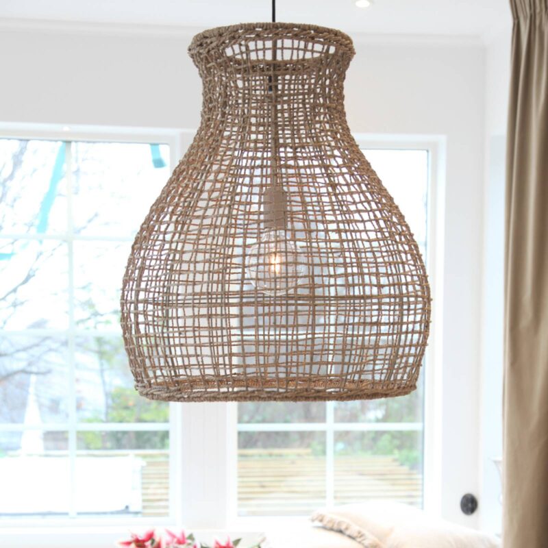 Závesná lampa Seagrass vyrobená z hnedého lana z prírodného vlákna tienidlo na lampu prívesného svetla Seagrass je tvorené otvorenou väzbou z hnedých lán, ktoré vytvárajú cibuľovitý zakrivený tvar. Medzery – rovnako ako zvislé otvory – umožňujú výhľad na žiarovku, takže dekoratívna žiarovka je ideálnym doplnkom. Morská tráva obohacuje miestnosť prírodným nádychom a je možné ju kombinovať s mnohými rôznymi štýlmi vybavenia.
