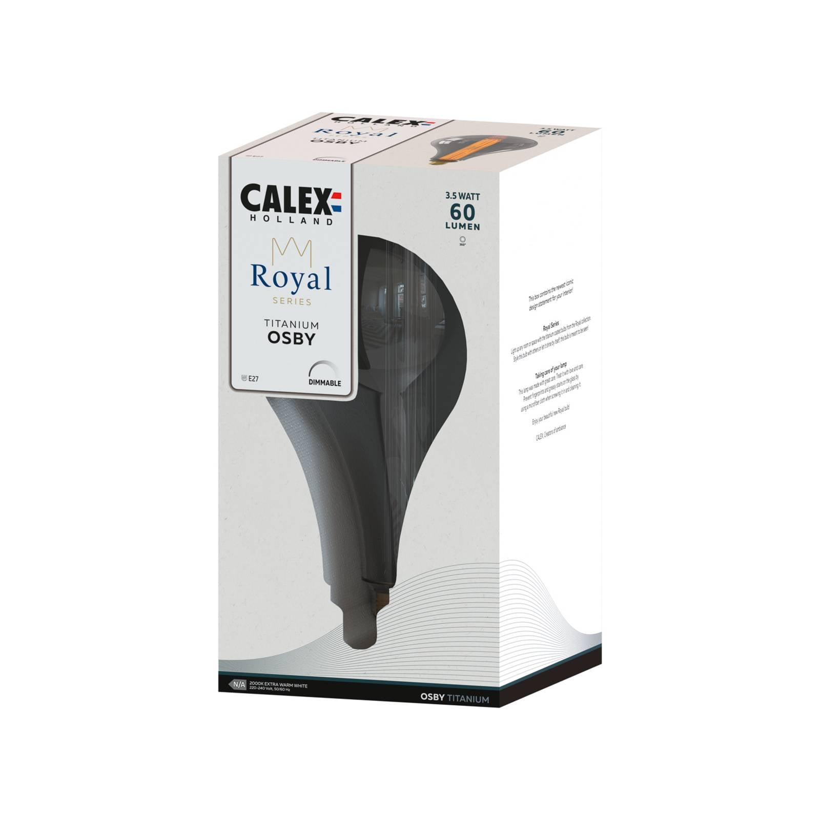 Stmievateľná LED lampa XXL Royal Osby Žiarovka s dymovo sivým odtieňom, 3,5 W, 2 000 K Elegantné žiarovky sú srdcom LED lampy Royal Osby. Séria Royal je kolekcia elegantných, veľkých svietidiel, ktoré dodajú luxusný vzhľad a atmosféru každej miestnosti. Lampy vo formáte XXL majú majestátne, rovné vlákno, ktoré poskytuje krásne svetlo a dokonale sa hodí do elegantného interiéru. Vďaka mimoriadne teplej farbe svetla vytvára táto elegantná lampa veľmi príjemnú atmosféru. Dymovo sivá povrchová úprava zaručuje, že sa táto moderná lampa E27 hodí do takmer každého interiéru. Osby je nápadným zvýraznením, ktoré môže byť ústredným bodom miestnosti a vyžaruje pocit vznešenosti a sofistikovanosti. So svietidlom Royal Osby alebo s niektorým z ďalších svietidiel zo série Royal od spoločnosti Calex zaručene dodáte svojmu interiéru mimoriadne luxusný vzhľad. – stmievateľné