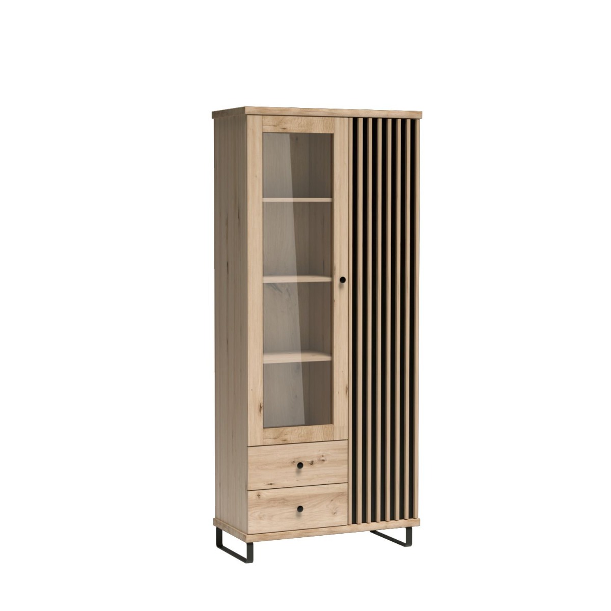 Mimoriadne módne lamely v kombinácii s čiernym, matným plátom a teplou farbou dreva robia sektorový nábytok CAROLYN výnimočným a neprehliadnuteľným. Je vyrobený pre tých, ktorí radi sledujú najnovšie trendy, ale riadia sa modernými a funkčnými riešeniami.Štýlová vitrína má dizajnový prvok v podobe lamiel, ktoré sú uchytené na dvierkach skrinky. Tmavé pozadie dodáva elegantný vzhľad. Vitrína má dve zásuvky, tri police za presklenými dvierkami a tri police za plnými dvierkami. Jemné čierne úchyty s farebným prevedením dub Artisan vytvárajú krásny celok. Je vyrobená z LTD dosky s hranami ABS. Vitrína stojí na zaujímavých kovových nožičkách,ktoré jej dodávajú jedinečný industriálny charakter.Rozmery (š/h/v) 86,4 x 40,6 x 201 cm. Dodávané v demonte. Všetky kúsky z kolekcie Carolyn kombinujú najkvalitnejšie materiály a solídne spracovanie.