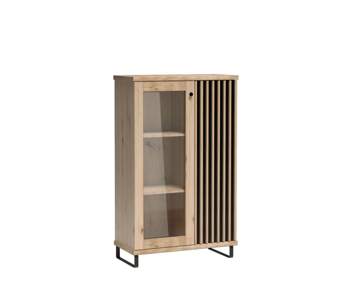 Mimoriadne módne lamely v kombinácii s čiernym, matným plátom a teplou farbou dreva robia sektorový nábytok CAROLYN výnimočným a neprehliadnuteľným. Je vyrobený pre tých, ktorí radi sledujú najnovšie trendy, ale riadia sa modernými a funkčnými riešeniami.Štýlová vitrína má dizajnový prvok v podobe lamiel, ktoré sú uchytené na dvierkach skrinky. Tmavé pozadie dodáva elegantný vzhľad. Vitrína má dve police za presklenými dvierkami a dve police za plnými dvierkami. Jemné čierne úchyty s farebným prevedením dub Artisan vytvárajú krásny celok. Je vyrobená z LTD dosky s hranami ABS. Vitrína stojí na dizajnových kovových nožičkách, ktoré jej dodávajú jedinečný industriálny charakter.Rozmery (š/h/v) 86,4 x 40,6 x 141,9 cm. Dodávané v demonte. Všetky kúsky z kolekcie Carolyn kombinujú najkvalitnejšie materiály a solídne spracovanie.
