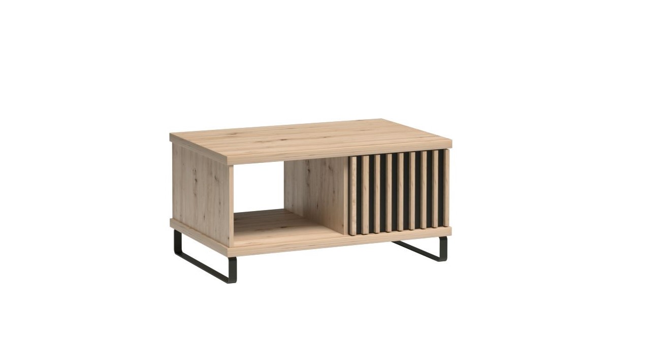 Mimoriadne módne lamely v kombinácii s čiernym, matným plátom a teplou farbou dreva robia sektorový nábytok CAROLYN výnimočným a neprehliadnuteľným. Je vyrobený pre tých, ktorí radi sledujú najnovšie trendy, ale riadia sa modernými a funkčnými riešeniami.Štýlový konferenčný stolík do obývačky má dve police a jednu zásuvku, ktorá je zdobená lištami na čiernom podklade. Vyrobený je z kvalitnej LTD dosky s hranami ABS. Stolík stojí na zaujímavých kovových nožičkách, ktoré mu dodávajú výnimočný a industriálny charakter.Rozmery (š/h/v) 90x 58 x 46 cm. Dodávané v demonte. Všetky kúsky z kolekcie CAROLYN kombinujú najkvalitnejšie materiály a solídne spracovanie.