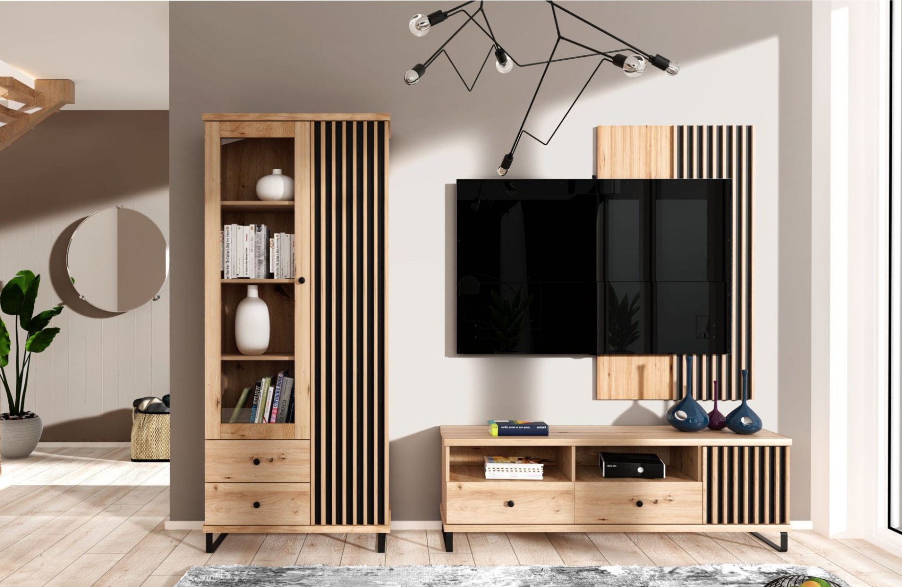 Mimoriadne módne lamely v kombinácii s čiernym, matným plátom a teplou farbou dreva robia sektorový nábytok CAROLYN výnimočným a neprehliadnuteľným. Je vyrobený pre tých, ktorí radi sledujú najnovšie trendy, ale riadia sa modernými a funkčnými riešeniami.Obývacia zostava je vyrobená z kvalitného LTD materiálu s hranami ABS vo farbe dub Artisan. Vitrína a TV stolík stoja na dizajnových kovových nožičkách, ktoré celej zostave dodávajú nezvyčajný a industriálny charakter.V zostave sa nachádza:Vysoká vitrína C2 (š/h/v) 86,4 x 40,6 x 201 cmZávesný panel dub artisan C10 za TV (š/h/v) 80 x 3,2 x 138 cmTV skrinka C6 (š/h/v) 160,6 x 40,6 x 53,4 cmTV skrinka poskytuje dostatok úložného priestoru v podobe dvoch zásuviek, zatvorenej skrinky a otvorených políc. Úložný priestor ponúka tiež vitrína, ktorá obsahuje dve zásuvky, tri police za sklenenými dvierkami a tri police za lamelovými dvierkami. Praktickosť dopĺňa kovanie s tichým dovieraním. Možnosť dokúpenia ďalších prvkov sektoru. Dodávané v demonte. Všetky kúsky z kolekcie CAROLYN kombinujú najkvalitnejšie materiály a solídne spracovanie.