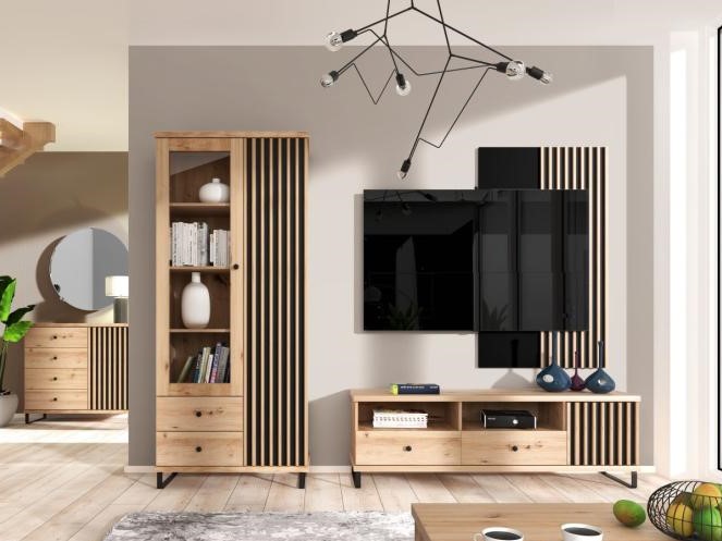 Mimoriadne módne lamely v kombinácii s čiernym, matným plátom a teplou farbou dreva robia sektorový nábytok CAROLYN výnimočným a neprehliadnuteľným. Je vyrobený pre tých, ktorí radi sledujú najnovšie trendy, ale riadia sa modernými a funkčnými riešeniami.Obývacia zostava je vyrobená z kvalitného LTD materiálu s hranami ABS vo farbe dub Artisan. Vitrína a TV stolík stoja na dizajnových kovových nožičkách, ktoré celej zostave dodávajú nezvyčajný a industriálny charakter.V zostave sa nachádza:Vysoká vitrína C2 (š/h/v) 86,4 x 40,6 x 201 cmZávesný panel čierny C10 za TV (š/h/v) 80 x 3,2 x 138 cmTV skrinka C6 (š/h/v) 160,6 x 40,6 x 53,4 cmTV skrinka poskytuje dostatok úložného priestoru v podobe dvoch zásuviek, zatvorenej skrinky a otvorených políc. Úložný priestor ponúka tiež vitrína, ktorá obsahuje dve zásuvky, tri police za sklenenými dvierkami a tri police za lamelovými dvierkami. Praktickosť dopĺňa kovanie s tichým dovieraním. Možnosť dokúpenia ďalších prvkov sektoru. Dodávané v demonte. Všetky kúsky z kolekcie CAROLYN kombinujú najkvalitnejšie materiály a solídne spracovanie.