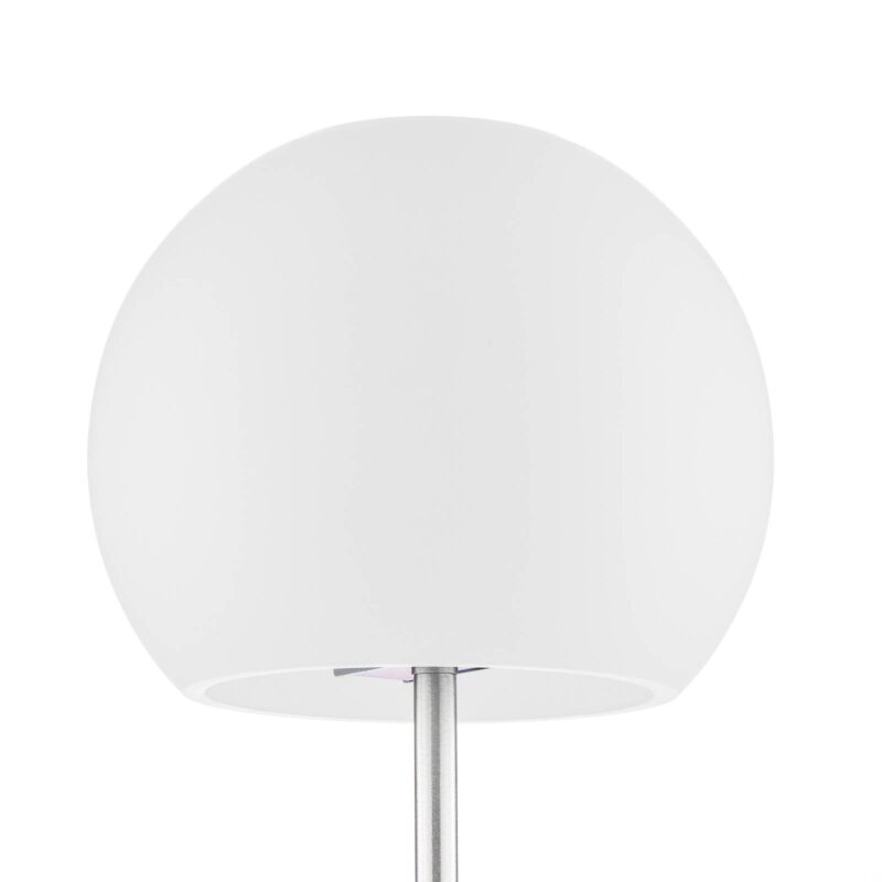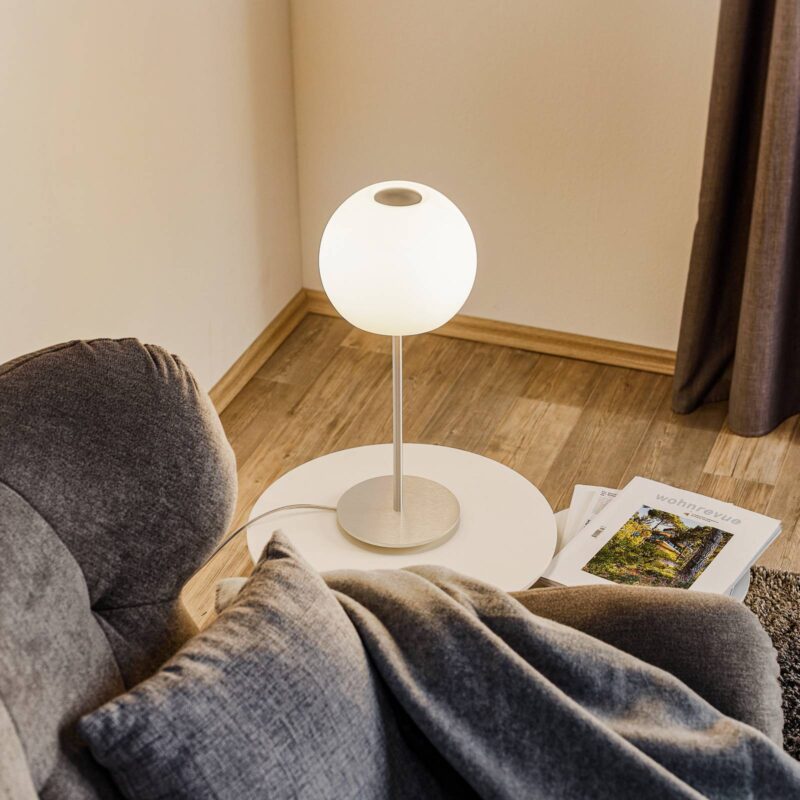 Moderná stolová lampa Ball na písací stôl alebo komodu Takmer 50 cm vysoká stolová lampa Ball je vynikajúcim dekoračným prvkom a zároveň nádherným zdrojom svetla. Moderne a elegantne sa začlení napríklad umiestnená na stole alebo na komode do každého priestoru a jemne osvetľuje okolie. Podstavec z brúseného hliníka je veľmi stabilný a nesie ručne fúkané sklené tienidlo. Celkom hore na tienidle sa znova nachádza ploché dekoračné koliesko z toho istého materiálu, hliníka. Dve 40 wattové žiarovky vo vnútri tienidla vytvárajú v bezprostrednej blízkosti netienené osvetlenie. Vhodné halogénové žiarovky dostať v obchode medzi príslušenstvom. Vkusné žiarovky tohto výrobcu majú zabezpečenú stálu kontrolu kvality. Veľmi kvalitné materiály, ako je sklo a hliník a remeselné výrobky zhotovené s radosťou prispievajú k elegancii a individualite výrobkov. Výsledkom sú inšpiratívne klasické lampy, ktoré dodávajú moderným obytným priestorom osobný nádych.