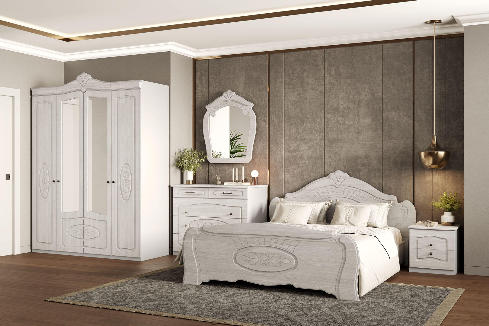 Nábytok do spálne CATHERINE predstavuje štýlovú kolekciu nábytku, ktorá umožní komfortné vybavenie spálne. Vysoká funkčnosť jednotlivých súčastí a atraktívny design sú zárukou zákazníkovej spokojnosti.Jednotlivé prvky tejto kolekcie sa môžu pochváliť vysokou kvalitou prevedenia, precíznym spracovaním a v neposlednom rade nezvyčajným dizajnom s ozdobným frézovaním dvierok.Rošt je v cene. Matrac je potrebné dokúpiť. (160 x 200)Zostava obsahuje:Zrkadlo nástenné: 785 x 950 x 35 mmKomoda so zásuvkami: 1090 x 890 x 470 mmNočný stolík 2 ks: 460 x 475 x 435 mmŠatníková skriňa 4D: 1780 x 2330 x 595 mmPosteľ 160 s roštom: 1800 x 1110 x 2080 mmFarebné prevedenie: ľadový dub / biela Nymphea albaNábytok dodávame v demonte s návodom na montáž.
