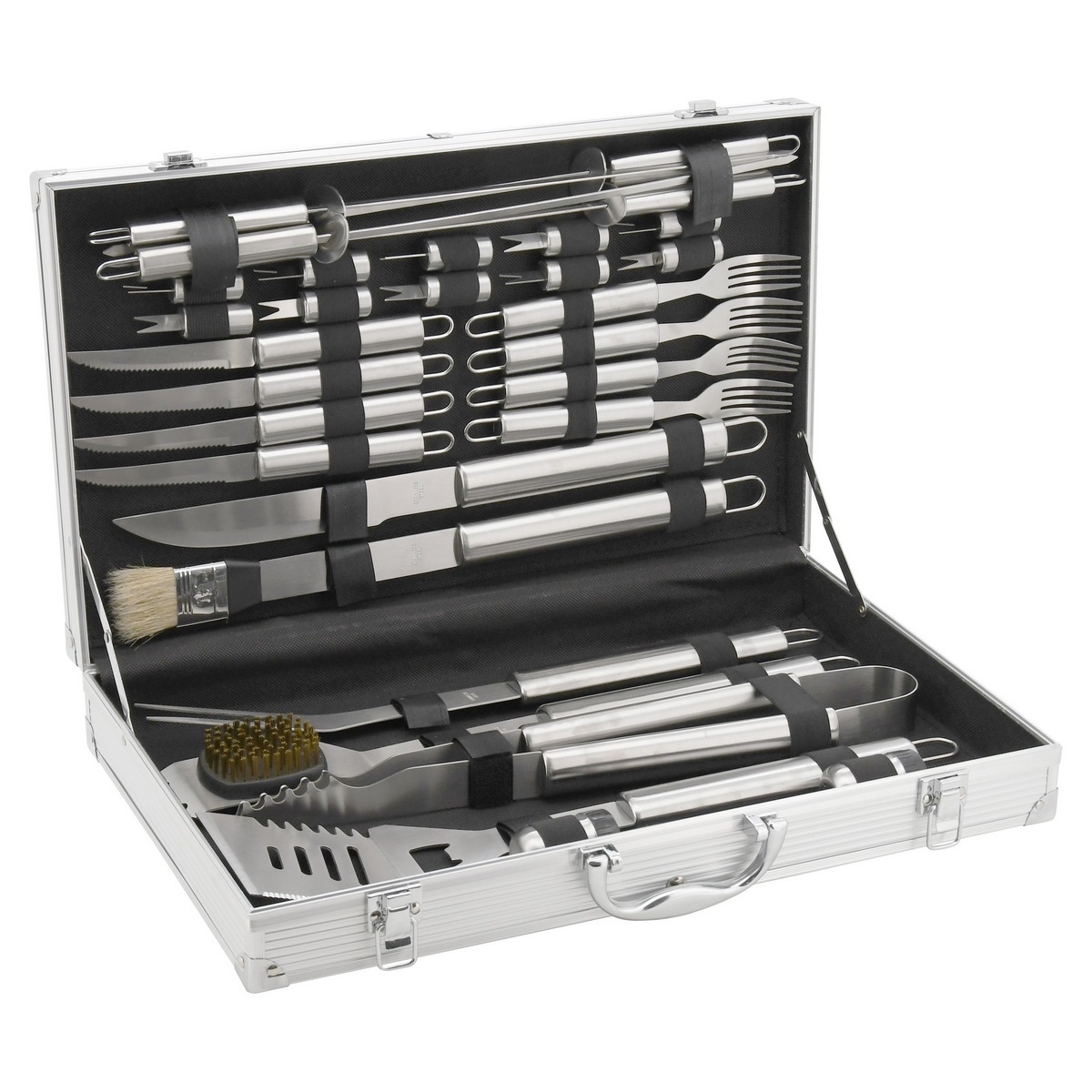 Súprava obsahuje základné nástroje (lopatka, kliešte, vidlička, štetec, krájací nôž), ako aj širokú škálu doplnkov, ktoré posunú vaše grilovanie na novú úroveň. Nechýbajú ihlice na špízy, držiaky na kukuricu ani kompletný príbor pre štyri osoby. Súčasťou balenia je dokonca aj soľnička a korenička. Toto rozsiahle vybavenie pokrýva celý proces prípravy jedla od surovín až po servírovanie.