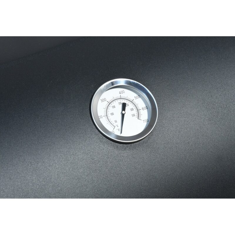 Veko je opatrené vstavaným teplomerom na kontrolu teploty, rozmerná grilovacia plocha s chrómovanou mriežkou a praktická odkladacia polica v prednej časti grilu zaistia pohodlnú prípravu pochutín. Pre reguláciu prúdenia vzduchu možno nastaviť klapku na komíne a zaroveň otvoriť prívod vzduchu na boku sekundárneho grilovacieho priestoru.