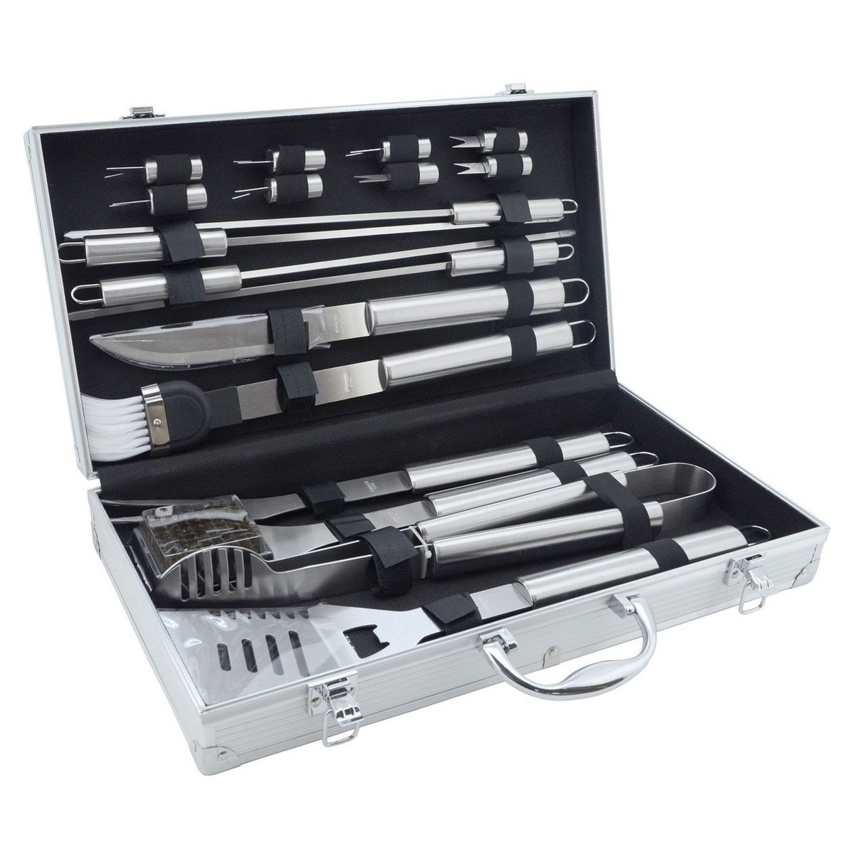 Profesionálna súprava grilovacieho náčinia so všetkým, čo pre grilovanie potrebujete. Súprava obsahuje načinie na prípravu najrôznejších pokrmov a aj následnú údržbu grilu. Je úhľadne umiestnená v transportnom alumíniovom kufríku a vhodná aj pre náročných užívateľov. Súprava je primárne určená nielen na využitie doma, v záhrade, ale aj na cestách. Materiál nástrojov: nehrdz. oceľ.Obsah sady: