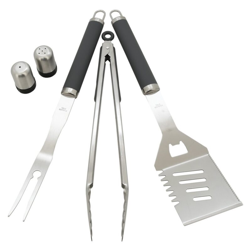 Táto sada so základnými potrebami pre grilovanie sa bude hodiť do každej domácnosti. Jednotlivé náradie je kvalitne zhotovené z nehrdzavejúcej ocele, nie je nijako zbytočne tvarované, čo významne uľahčuje čistenie. Rukoväte jednotlivých nástrojov sú silikónové a výborne padnú do ruky. Všetky nástroje možno zavesiť na háčik. Navyše sa dajú vložiť do zástery, môžete ich mať tak počas grilovania stále pri sebe.Sada obsahuje: