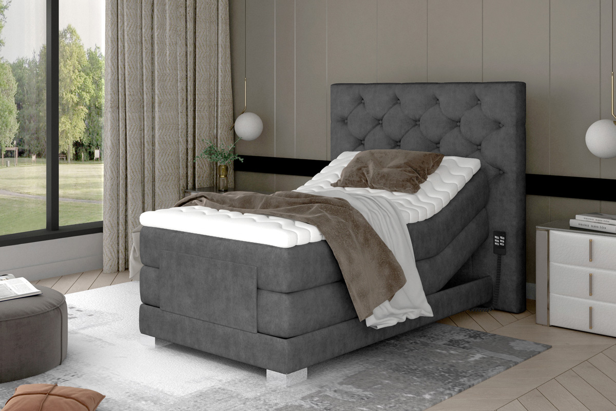 CEDRIK je výnimočná posteľ v luxusnom prevedení so spacou plochou 90 x 200 cm. Patrí medzi vysoké boxspringové jednolôžka, ktoré ponúkajú jednoduché vstávanie a sadanie na posteľ. Elektricky nastaviteľný rám s diaľkovým ovládaním dáva možnosť polohovania matraca pri hlave aj pri nohách (viď foto). Vďaka tomu si viete nastaviť ideálnu polohu podľa vlastných požiadaviek. Najvýraznejším dizajnovým prvkom je vyvýšené čelo postele, ktoré poskytne pohodlnú opierku hravy a ochráni stenu pred oderom. Zaujímavý je aj dizajn predného čela. Jednofarebné prevedenie dáva možnosť variabilnej kombinácie s ďalším nábytkom či farbami.Posteľ ponúka viac vrstiev matracov. Spodný matrac je vyrobený z bonellovej pružiny, stredový je pocketový. Pre zabezpečenie ešte vyššieho komfortu je súčasťou postele horný topper, ktorý tvorí PUR pena T2542. Posteľ je celočalúnená kvalitnou látkou Dora 95.Rozmery (š/v/h): 108 x 130 x 217 cm. Výška ložnej plochy je 67 cm. Hrúbka zadného čela je 15 cm. Matrac je obojstranný. Poťah je hypoalergénny, snímateľný a prateľný pri 40 ℃. Tvrdosť postele je H3. Posteľ sa predáva kompletná, nie je potrebné doobjednávať rošt ani matrac.Posteľ CEDRIK Vám poskytne komfort, pohodlie a štýlový dizajn. V našej ponuke nájdete aj ďalšie rozmery a farebné prevedenia tejto unikátnej postele.
