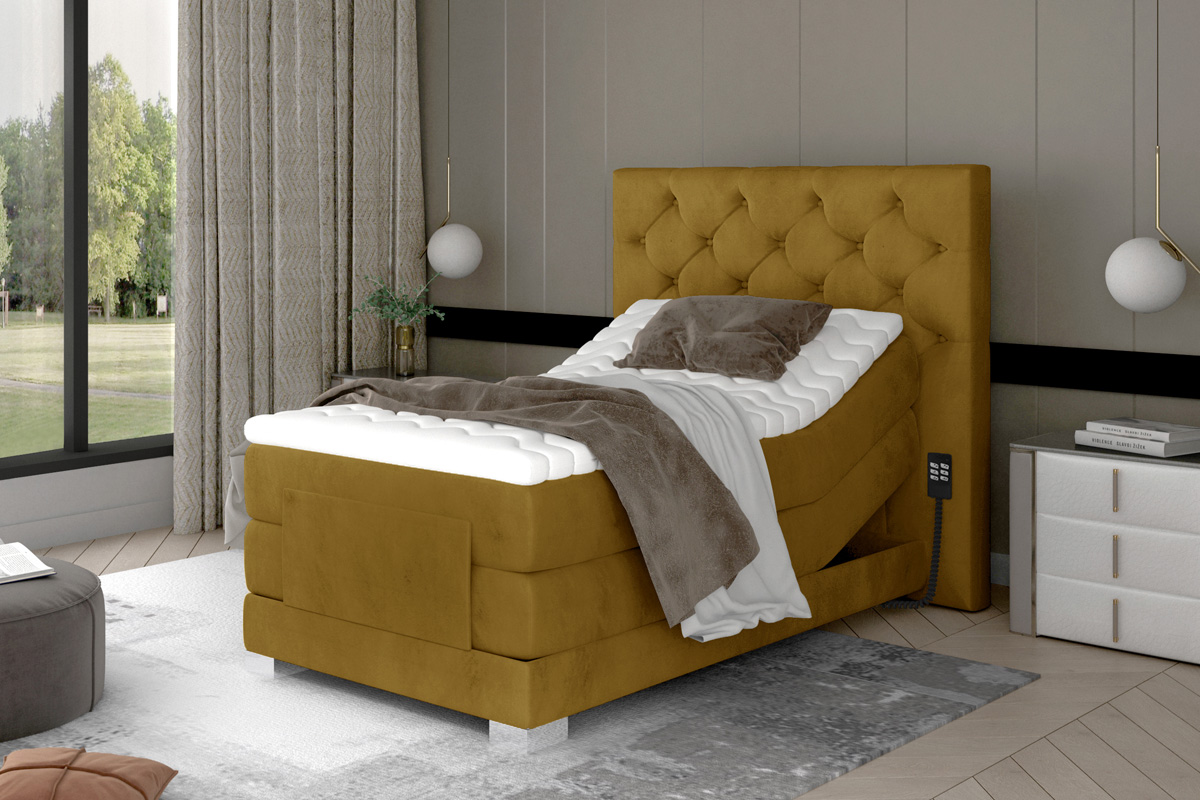CEDRIK je výnimočná posteľ v luxusnom prevedení so spacou plochou 90 x 200 cm. Patrí medzi vysoké boxspringové jednolôžka, ktoré ponúkajú jednoduché vstávanie a sadanie na posteľ. Elektricky nastaviteľný rám s diaľkovým ovládaním dáva možnosť polohovania matraca pri hlave aj pri nohách (viď foto). Vďaka tomu si viete nastaviť ideálnu polohu podľa vlastných požiadaviek. Najvýraznejším dizajnovým prvkom je vyvýšené čelo postele, ktoré poskytne pohodlnú opierku hravy a ochráni stenu pred oderom. Zaujímavý je aj dizajn predného čela. Jednofarebné prevedenie dáva možnosť variabilnej kombinácie s ďalším nábytkom či farbami.Posteľ ponúka viac vrstiev matracov. Spodný matrac je vyrobený z bonellovej pružiny, stredový je pocketový. Pre zabezpečenie ešte vyššieho komfortu je súčasťou postele horný topper, ktorý tvorí PUR pena T2542. Posteľ je celočalúnená kvalitnou látkou Monolith 48.Rozmery (š/v/h): 108 x 130 x 217 cm. Výška ložnej plochy je 67 cm. Hrúbka zadného čela je 15 cm. Matrac je obojstranný. Poťah je hypoalergénny, snímateľný a prateľný pri 40 ℃. Tvrdosť postele je H3. Posteľ sa predáva kompletná, nie je potrebné doobjednávať rošt ani matrac.Posteľ CEDRIK Vám poskytne komfort, pohodlie a štýlový dizajn. V našej ponuke nájdete aj ďalšie rozmery a farebné prevedenia tejto unikátnej postele.