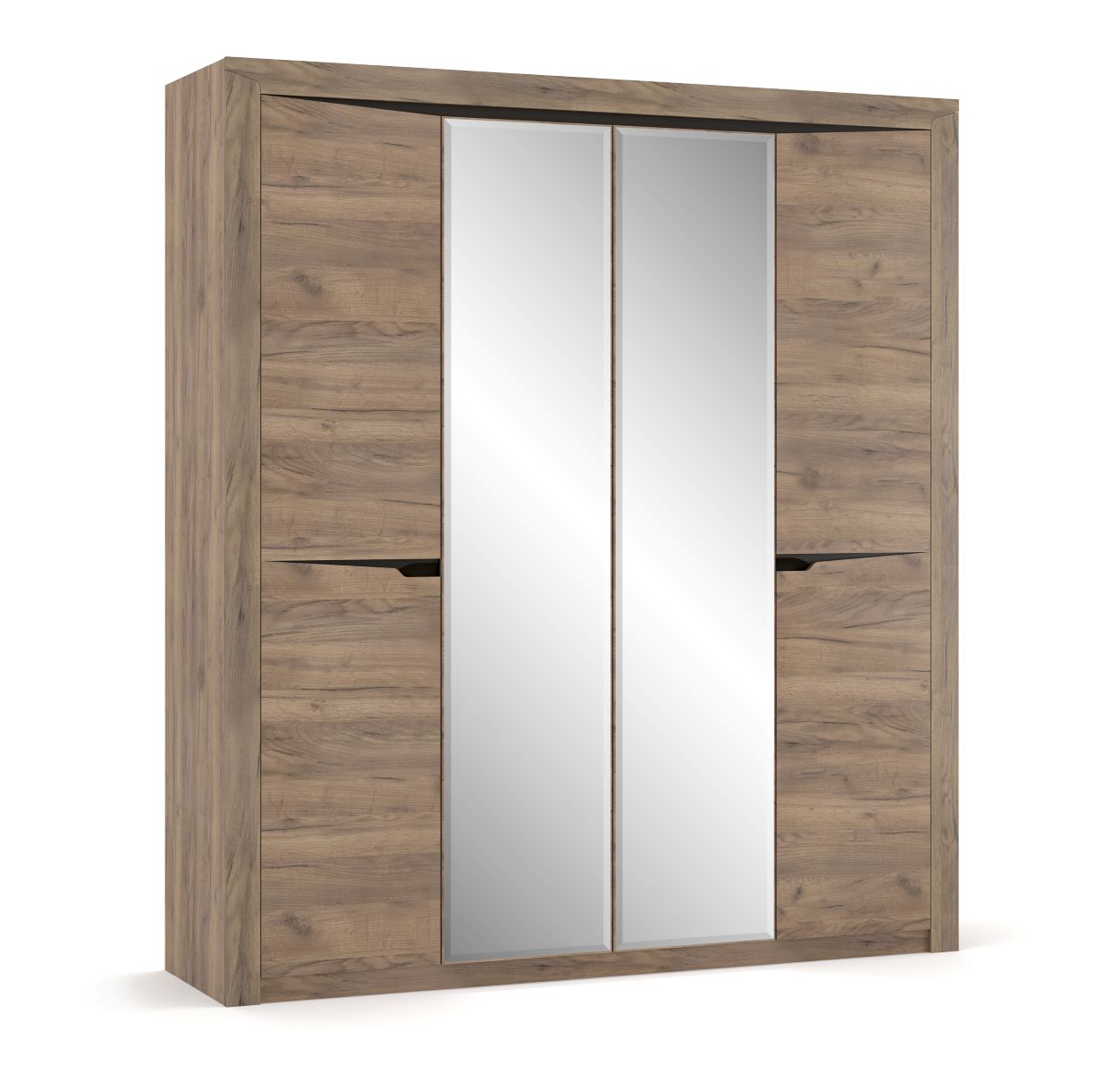 Štvordverová šatníková skriňa CELEST je vyrobená z kvalitnej MDF dosky, čo jej dodáva masívny vzhľad. Teplý odtieň wenge/dub tabacco vytvára pocit útulnosti. Úchyty sú nahradené netradičným frézovaním. Stredová časť dverí je doplnená zrkadlom.Vo vnútri sú po ľavej strane štyri police, vpravo je jedna polica a šatníková tyč. Rozmery (ŠxVxH): 196 x 220 x 54 cm.Spoločne s ďalšími prvkami sektoru CELEST si zariadite útulnú spálňu moderne a pritom za veľmi prijateľnú cenu.Dodávame v demonte.