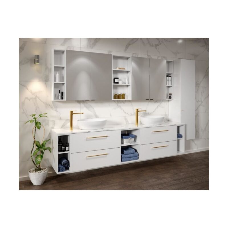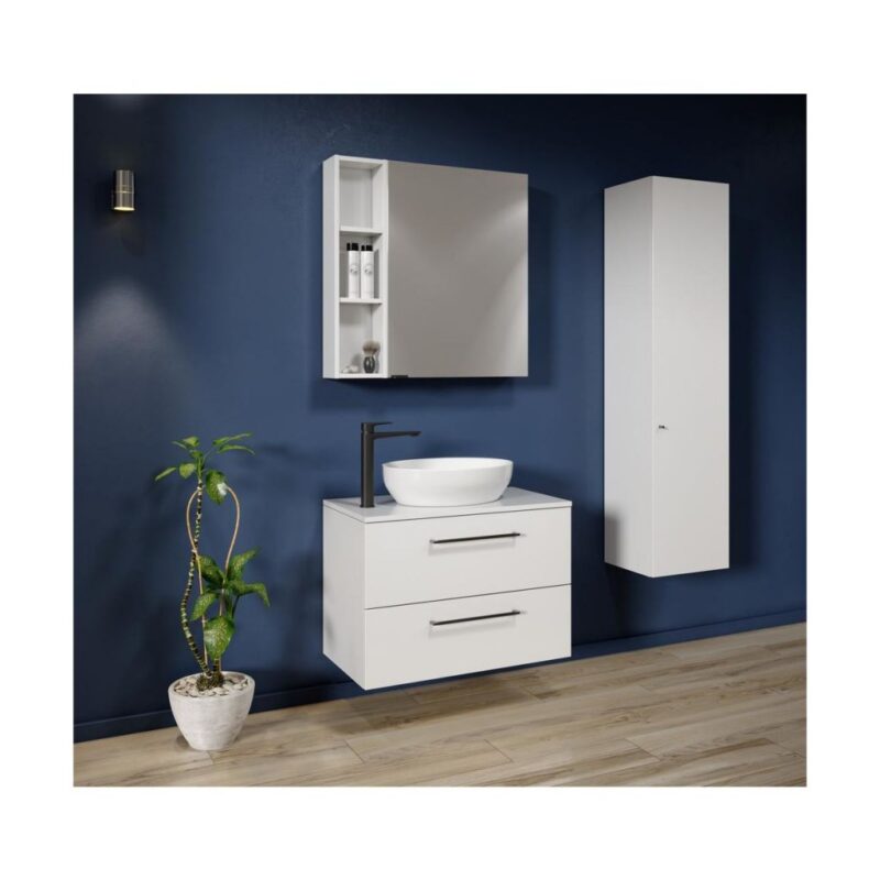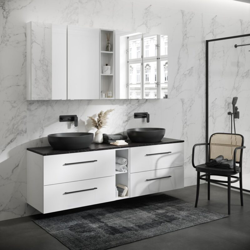 Závesná umývadlová skrinka vyrobená z drevotrieskovej dosky radu LARGA s dvomi priestrannými zásuvkami vnútri šedej farby. Zásuvky sú vybavené systémom tichého dovierania „soft close“Nábytková frézovaná madlá možno vybrať v troch farbách (strieborné, zlaté, čierne), k zakúpeniu samostane, nie je súčasťou skrinky.Umývadlo možno inštalovať s nábytkovým umývadlom alebo s použitím odkladacie dosky a následne vybrať umývadlo na dosku. Ean: 5901771006428