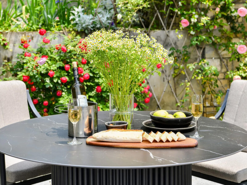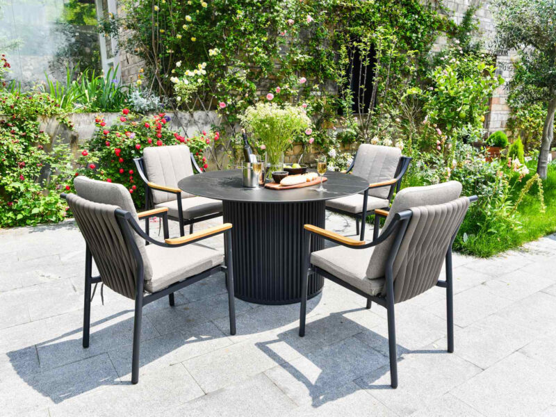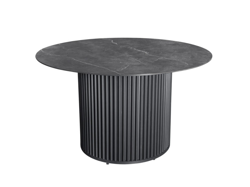 Okrúhly jedálenský stôl Chamonix s výrazným podstavcom a doskou zo sintrového kameňa ponúka moderný vzhľad a pevnosť, ideálny do interiéru aj exteriéru.