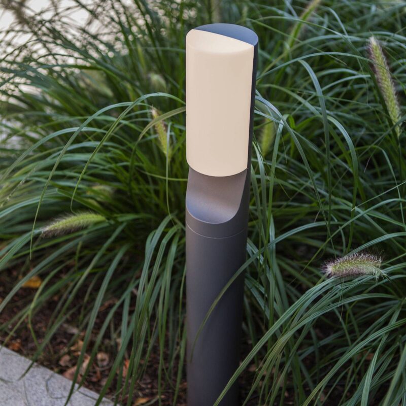 Moderné LED cestné svetlo Bati ako antracitovo čierny valec Valcové cestné svetlo Bati je opticky jednoduché a moderné. Je vyrobený z hliníka s povrchovou úpravou antracitová čierna. Telo je v hornej časti z jednej strany vykrojené; opálový plastový difúzor nájdete tu. Vo vnútri sa nachádzajú univerzálne biele LED diódy, ktorých svetlo osvetľuje priestor pred a vedľa svietidla.