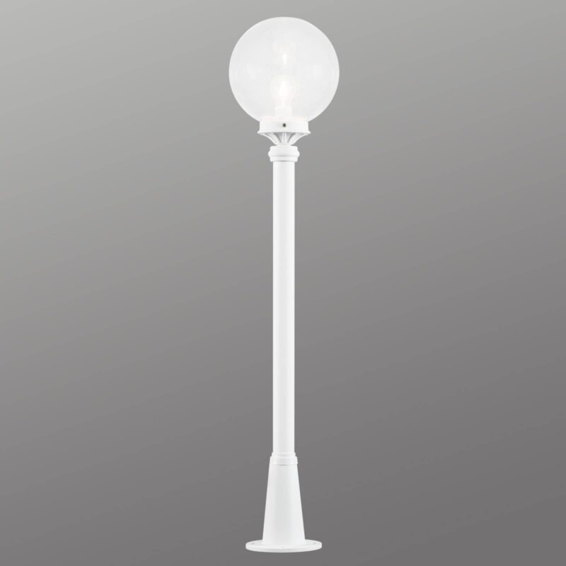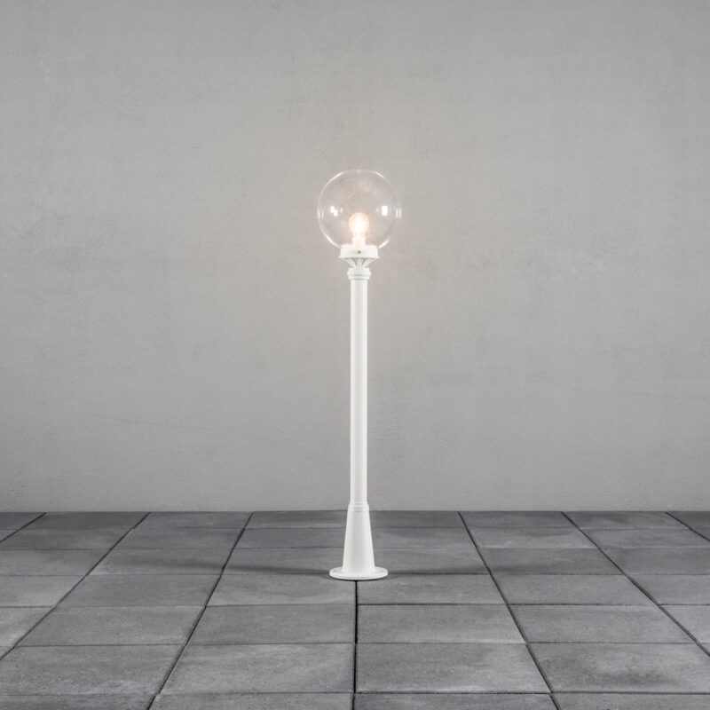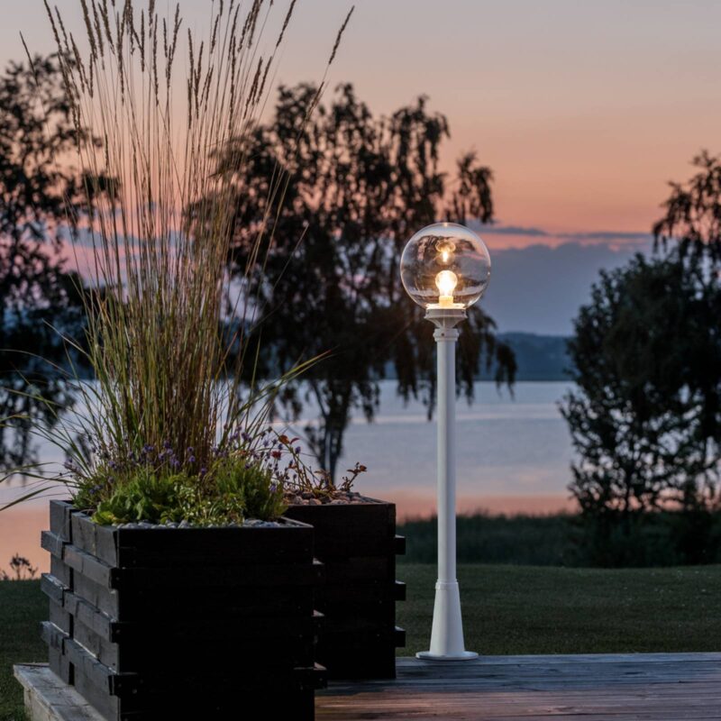 Linus – biele cestné svetlo s jasnou guľou Cestné svetlo Linus bolo vyrobené z matného bieleho lakovaného kovu jednoduchým, ale efektívnym spôsobom. Na vrchu je číry akrylový tienidlo na lampu vo forme gule. Prostredníctvom neho svetlo osvetľuje rozsiahlu oblasť všade naokolo. Cestné svetlo s päticou E27 je možné prevádzkovať so všetkými typmi svetelných zdrojov, od bežných žiaroviek do 60 W až po energeticky úsporné žiarovky a moderné LED žiarovky, najefektívnejšie a najdlhšie fungujúce zo všetkých svetelných zdrojov.