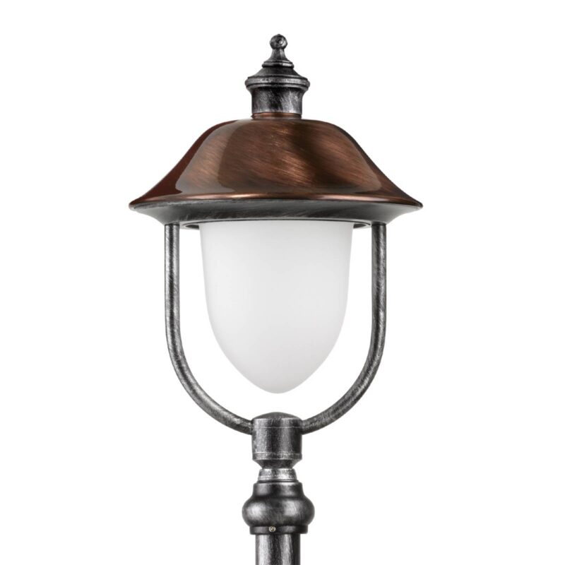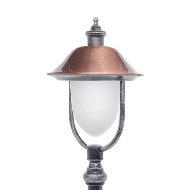 Dekoratívne cestné svetlo Peggy Pôvabne tvarované cestné svietidlo Peggy s ozdobnou kapotou z medi a bielym sklom lampy, ktoré voľne visí v ráme pod touto kapotou, je účinným a energeticky úsporným zdrojom svetla pre mnohé vonkajšie priestory. Možno ho prevádzkovať s bežnými alebo úspornými svetelnými zdrojmi alebo aj so žiarovkami LED s päticou E27. Cestné svetlo je vyrobené z vysokokvalitného hliníka, je odolné, robustné a nadčasové.