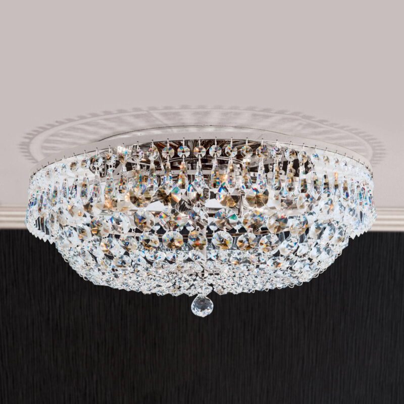 Prvotriedne stropné svietidlo SHERATA pre žiarivé okamihy Stropné svietidlo SHERATA skrášľuje miestnosť impozantným a očarujúcim spôsobom. Celé svietidlo sa trbliece a žiari ako hviezda, pretože je celé zdobené ligotavými krištáľmi Schöler. Vo vnútri svietidla, je za krištáľmi šikovne ukrytých šesť 40 W žiaroviek, ktoré svojím svetlom prenikajú smerom von a v miestnosti vytvárajú trblietavé svetelné efekty. Priemer tohto ladného svietidla je 45 cm. Táto lampa predstavuje klenot každej miestnosti, či už v súkromných alebo gastronomických priestoroch. Z dôvodu svojej prenikavej prítomnosti, ktorú svetlo vyžaruje, sa však perfektne hodí najmä do špičkových hotelov. Toto svietidlo rakúskeho výrobcu vás osloví svojou prvotriednou kvalitou, dokonalým dizajnom a dlhou životnosťou. Atraktívne svietidlá sa v Rakúsku vyrábajú podľa starého remeselného umenia už od roku 1948 – a tešia sa veľkej obľube po celom svete. V prípade potreby môžete kedykoľvek požiadať o náhradné diely.