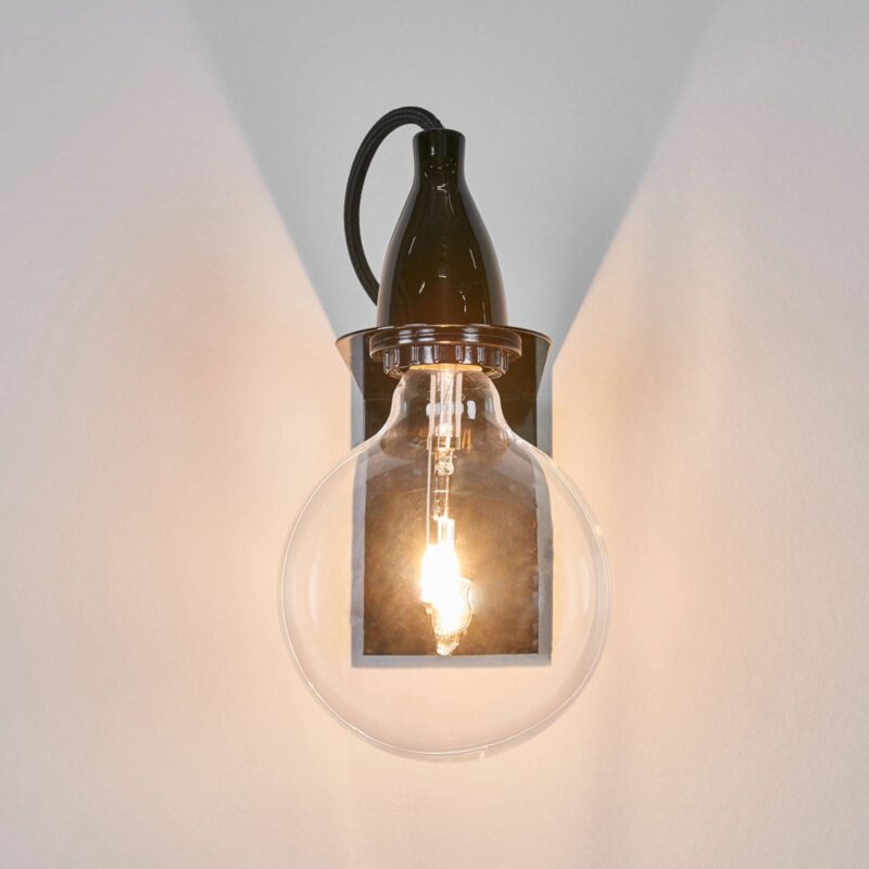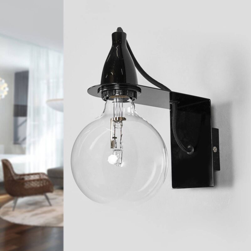 Moderné dizajnové nástenné svietidlo Minimal s čiernym rámom Táto dizajnová nástenná lampa sa z nejakého dôvodu nazýva Minimal, pretože vyzerá dosť minimalisticky a puristicky, pretože sa skladá z niečoho viac ako čierneho uhla vyrobeného z kovu. Do celkového dizajnu bola začlenená iba objímka žiarovky smerujúca nadol. Preto je veľká pozornosť venovaná samotnej žiarovke a mali by ste si lampu vyberať vedome, čím guľová lampa s väčšími rozmermi tu zaberie skutočne dobrú postavu.