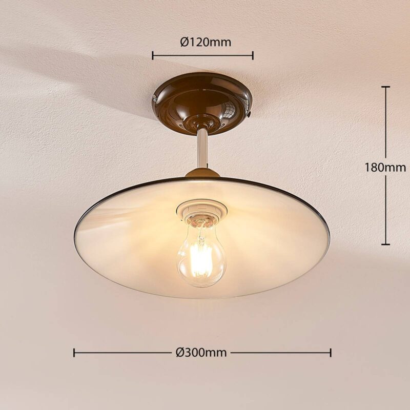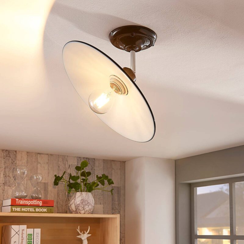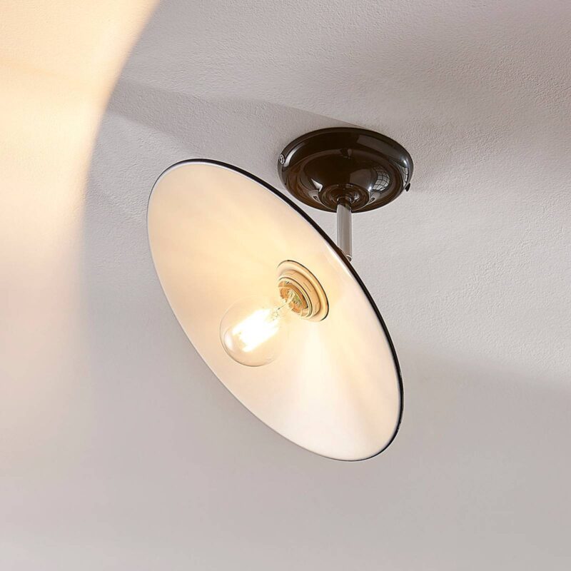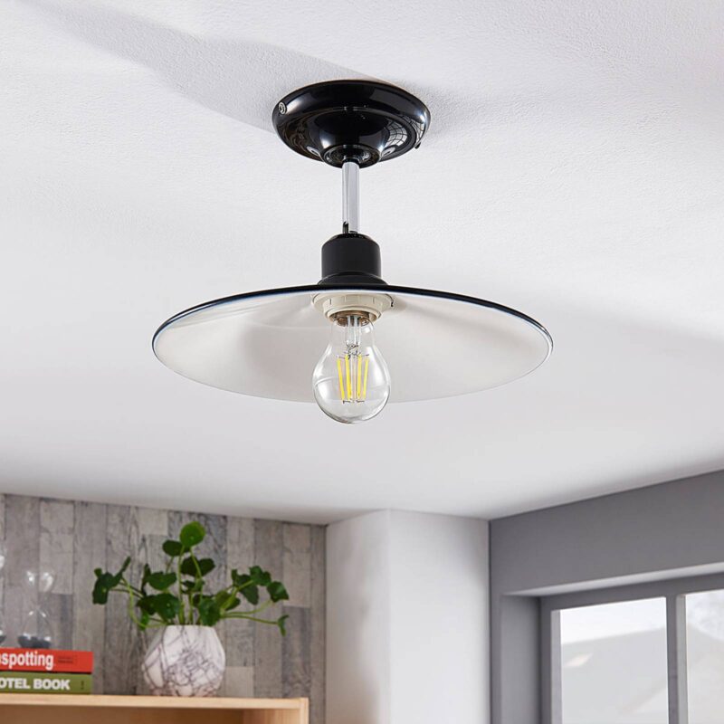 Lesklé kovové stropné svietidlo Phinea s čiernym povrchom vo vzhľade vintage Phinea je stropné svietidlo, ktoré prichádza v štýle vintage a zaujme svojím krásnym vzhľadom. Tienidlo je skôr ploché, vyrobené z kovu s lesklým čiernym vonkajším povrchom a bielym vnútrom. Otvorená konštrukcia svietidla ponúka jasný výhľad na žiarovku a zabezpečuje dobré osvetlenie miestnosti. Pri výbere svetelného zdroja je preto vhodné postupovať opatrne, najmä z optického hľadiska. Skvelou voľbou sú napríklad LED žiarovky v rustikálnom vzhľade s viditeľným vláknom.