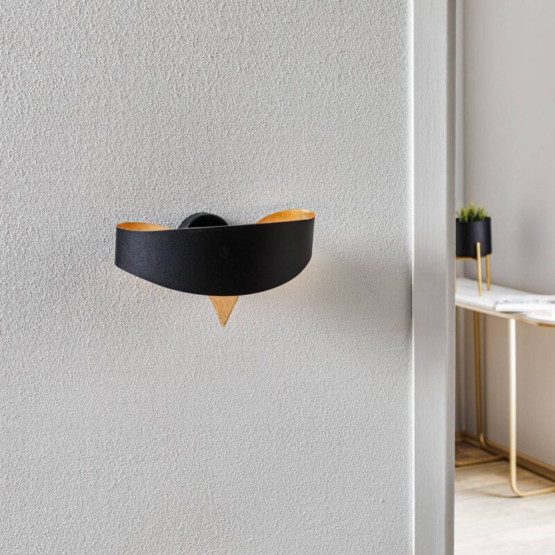 Nástenné svietidlo Scudo v dizajnovej kvaliteVysokokvalitné nástenné svietidlo Scudo spája najvyššiu kvalitu materiálu a výrobnej techniky. Elegantne tvarovaný oceľový pás sa najprv vyreže laserom a potom sa ručne ohne a dokončí. Svietidlový objekt slúži nielen ako úžitkový predmet na osvetlenie miestnosti. Je to skôr umelecká dizajnová skulptúra, ktorá dodáva interiéru luxusný a štýlový akcent. Kombinácia čierneho povrchu s vnútorným zlatým listom sa navyše nadčasovo hodí do najrôznejších štýlov interiéru.