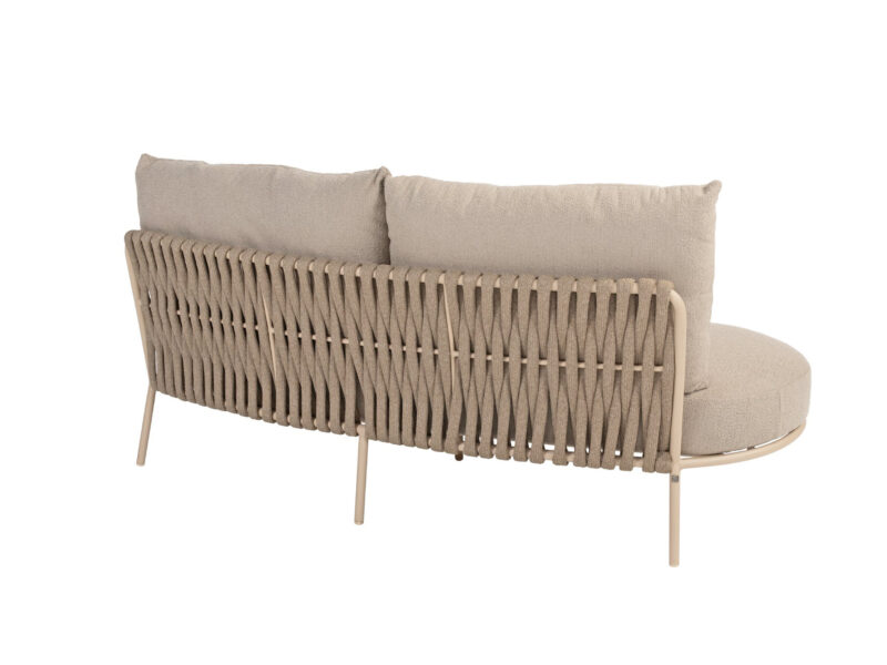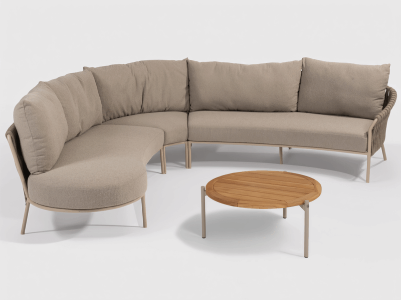 Elegantná sedacia súprava v teplom odtieni latte z hliníka, olefínu a výpletu z lana ponúka pohodlie, štýl a odolnosť. Doplnená o stolík Yoga s teakovou doskou a stabilnou hliníkovou konštrukciou – ideálna voľba pre nadčasové vonkajšie posedenie.